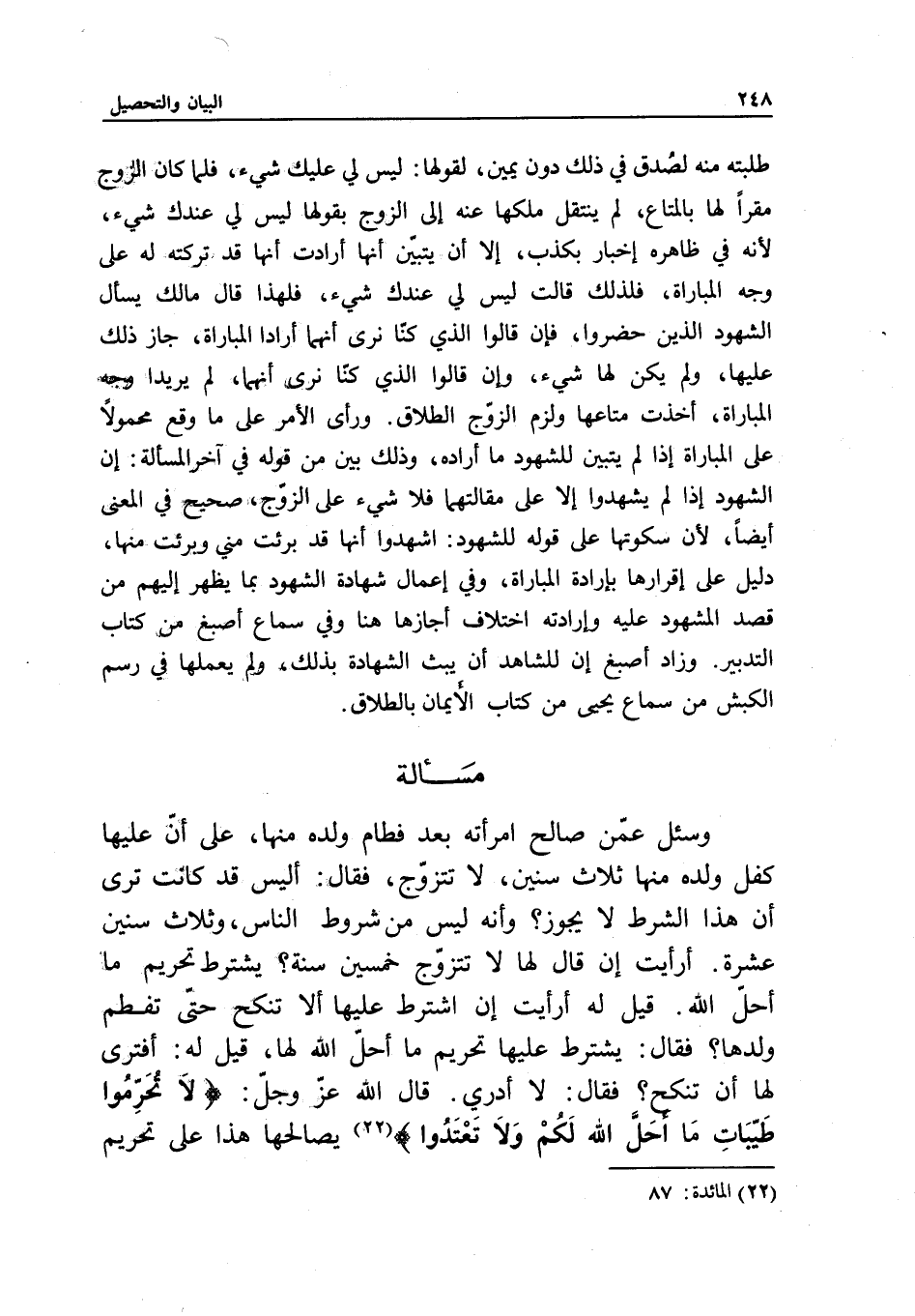 مسألة وسئل عمن صالح امرأته بعد فطام ولده منها، على أن عليها كفل ولده منها ثلاث سنين لا تتزوج، فقال: أليس قد كانت ترى أن هذا الشرط لا يجوز؟ وأنه ليس من شروط الناس، وثلاث سنين عشرة. أرأيت إن قال لها: لا تتزوج خمسين سنة؟ يشترط تحريم ما أحل الله، قيل له: أرأيت إن اشترط عليها ألا تنكح حتى تفطم ولدها؟ فقال: يشترط عليها تحريم ما أحل الله لها، قيل له: أفترى لها أن تنكح؟ فقال: لا أدري. قال الله عز وجل: {لا تُحَرِّمُوا طَيِّبَاتِ مَا أَحَلَّ اللَّهُ لَكُمْ وَلا تَعْتَدُوا} [المائدة: 87] يصالحها هذا على تحريم