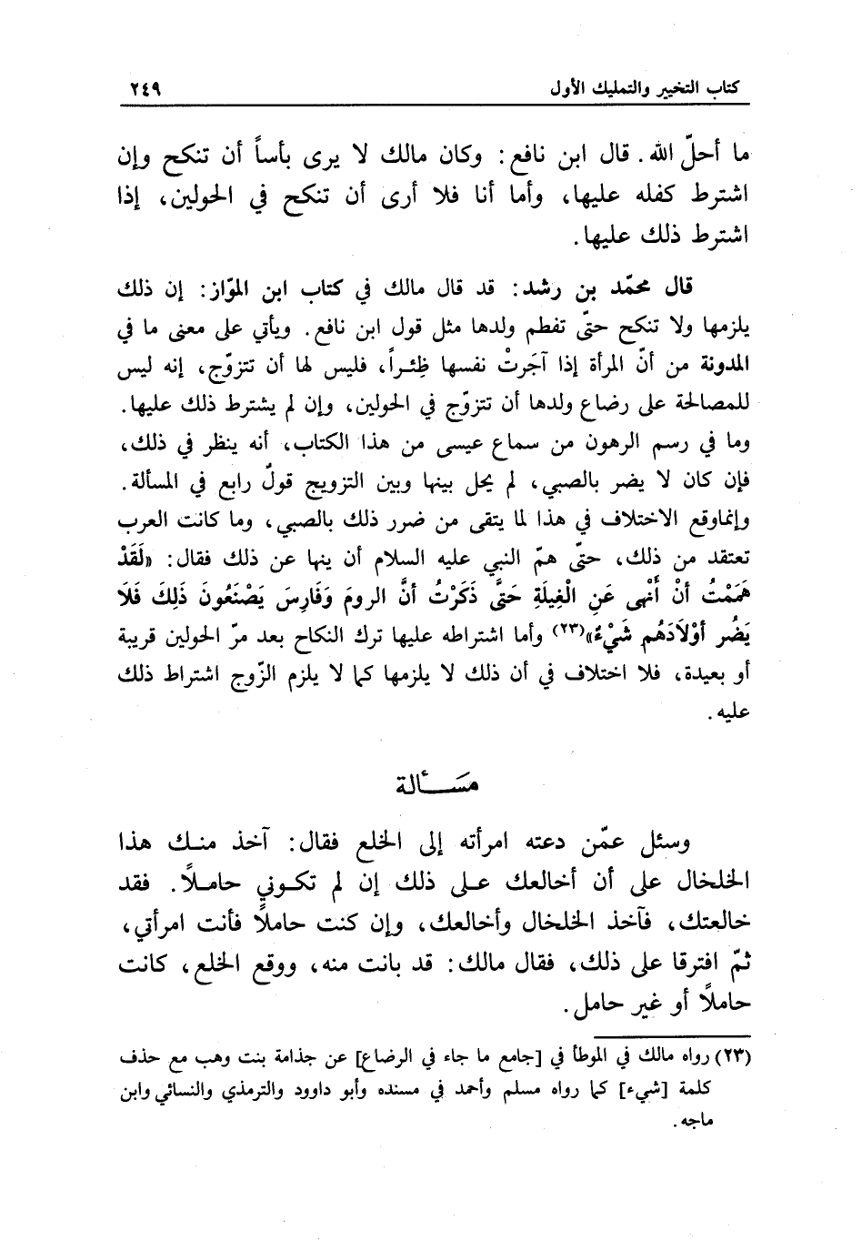ما أحل الله. قال ابن نافع: وكان مالك لا يرى بأسا أن تنكح، وإن اشترط كفله عليها، وأما أنا فلا أرى أن تنكح في الحولين، إذا اشترط ذلك عليها.
