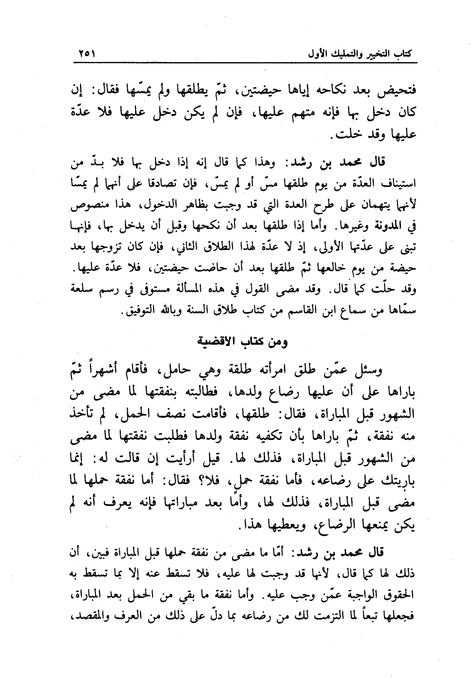 ومن كتاب الأقضية وسئل عمن طلق امرأته طلقة وهي حامل، فأقام أشهرا ثم باراها على أن عليها رضاع ولدها، فطالبته بنفقتها لما مضى من الشهور قبل المباراة، فقال: طلقها، فأقامت نصف الحمل، لم تأخذ منه نفقة، ثم باراها بأن تكفيه نفقة ولدها، فطلبت نفقتها لما مضى من الشهور قبل المباراة، فذلك لها، قيل: أرأيت إن قالت له: إنما باريتك على رضاعه، فأما نفقة حمل فلا؟ فقال: أما نفقة حملها لما مضى قبل المباراة، فذلك لها، وأما بعد مباراتها، فإنه يعرف أنه لم يكن يمنعها الرضاع، ويعطيها هذا.