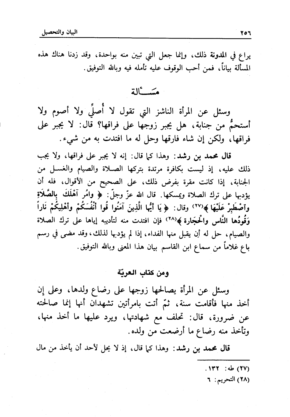 قال محمد بن رشد: وهذا كما قال: إنه لا يجبر على فراقها، ولا يجب ذلك عليه، إذ ليست بكافرة مرتدة بتركها الصلاة والصيام والغسل من الجنابة، إذا كانت مقرة بفرض ذلك، على الصحيح من الأقوال، فله أن يؤدبها على ترك الصلاة ويمسكها؛ قال الله عز وجل: {وَأْمُرْ أَهْلَكَ بِالصَّلاةِ وَاصْطَبِرْ عَلَيْهَا} [طه: 132] ، وقال: {يَا أَيُّهَا الَّذِينَ آمَنُوا قُوا أَنْفُسَكُمْ وَأَهْلِيكُمْ نَارًا وَقُودُهَا النَّاسُ وَالْحِجَارَةُ} [التحريم: 6] ، فإن افتدت منه لتأديبه إياها على ترك الصلاة والصيام، حل له أن يقبل منها الفداء، إذا لم يؤدبها لذلك، وقد مضى في رسم باع غلاما، من سماع ابن القاسم، بيان هذا المعنى، وبالله التوفيق.