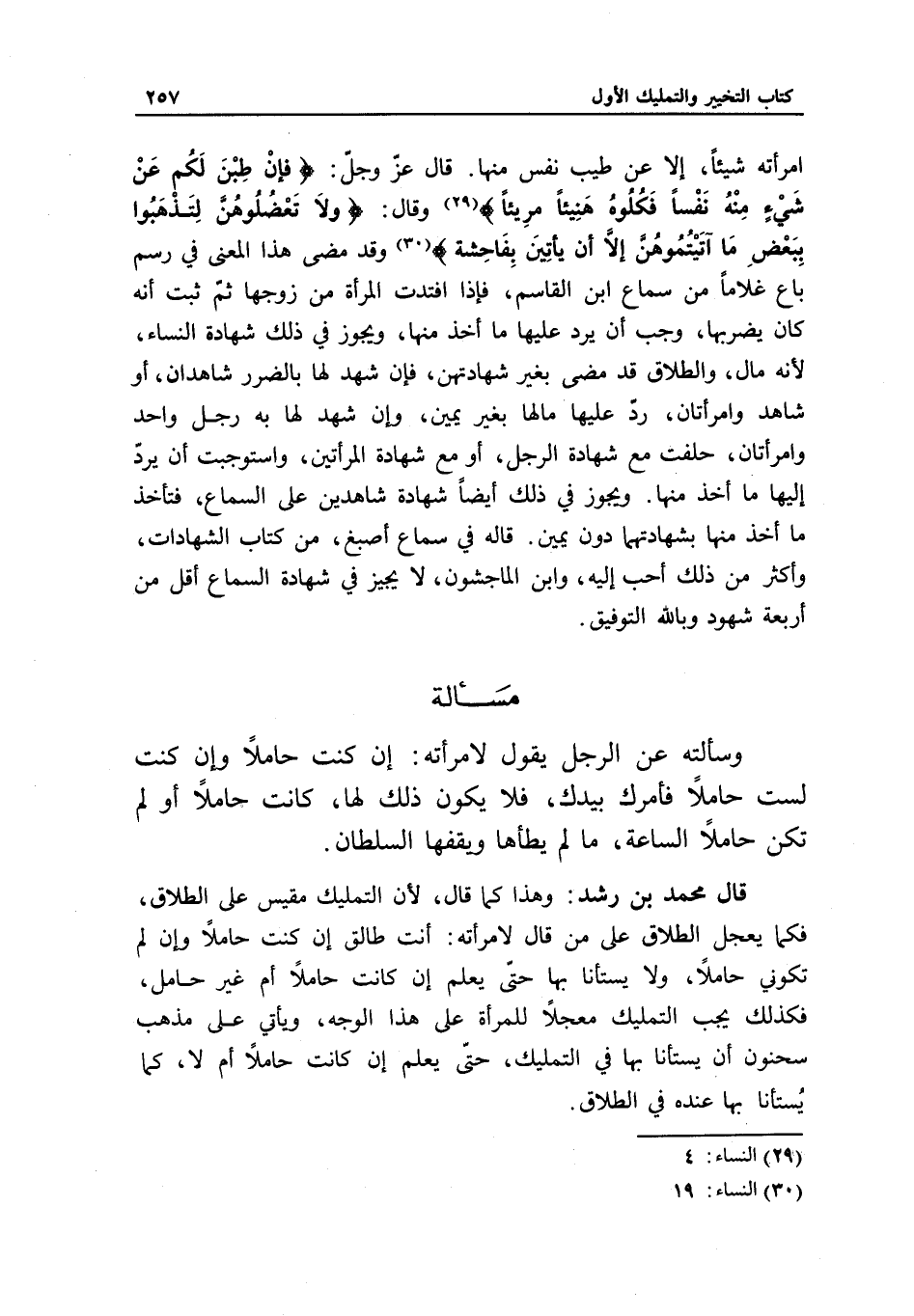 مسألة وسألته عن الرجل يقول لامرأته: إن كنت حاملا وإن كنت لست حاملا فأمرك بيدك، فلا يكون ذلك لها، كانت حاملا أو لم تكن حاملا الساعة، ما لم يطأها ويقفها السلطان.