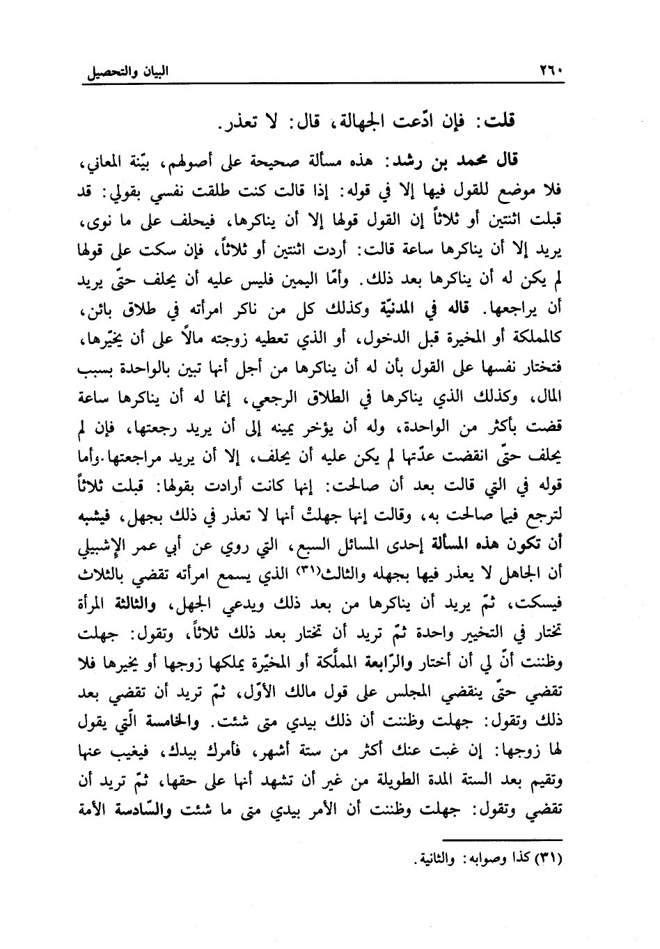 وأما قوله في التي قالت بعد أن صالحت: إنها كانت أرادت بقولها: "قبلت" ثلاثا لترجع فيما صالحت به، وقالت: إنها جهلت أنها لا تعذر في ذلك بجهل، فيشبه أن تكون هذه المسألة إحدى المسائل السبع، التي روي عن أبي عمر الإشبيلي أن الجاهل لا يعذر فيها بجهله، والثالث الذي يسمع امرأته تقضي بالثلاث فيسكت، ثم يريد أن يناكرها من بعد ذلك ويدعي الجهل، والثالثة المرأة تختار في التخيير واحدة ثم تريد أن تختار بعد ذلك ثلاثا، وتقول: جهلت وظننت أن لي أن أختار، والرابعة المملَّكة أو المخيَّرة يملكها زوجها أو يخيرها فلا تقضي حتى ينقضي المجلس على قول مالك الأول، ثم تريد أن تقضي بعد ذلك وتقول: جهلت وظننت أن ذلك بيدي متى شئت.