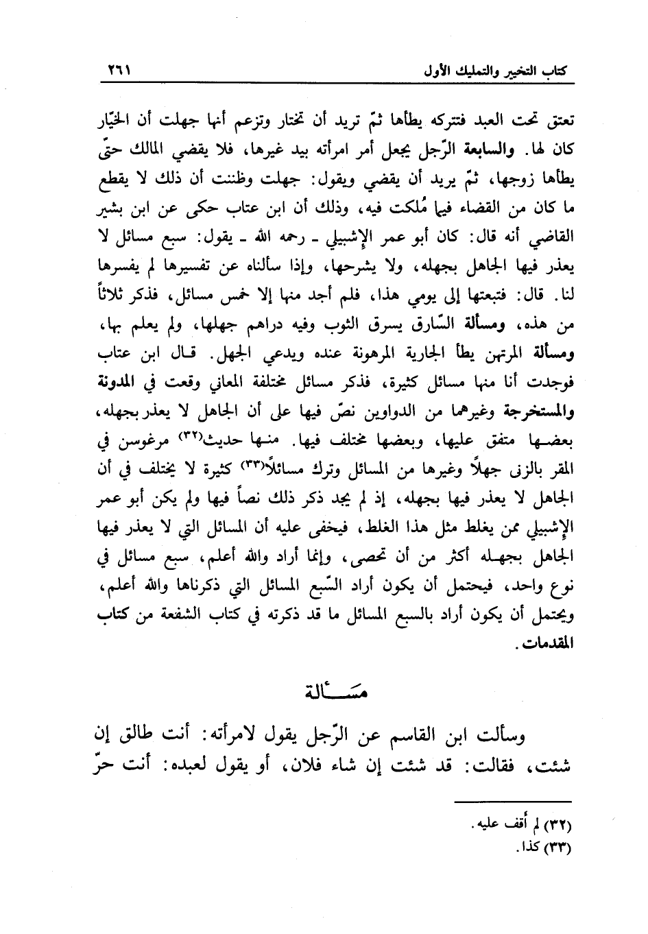 تعتق تحت العبد فتتركه يطأها، ثم تريد أن تختار وتزعم أنها جهلت أن الخيار كان لها. والسابعة الرجل يجعل أمر امرأته بيد غيرها، فلا يقضي المالك حتى يطأها زوجها، ثم يريد أن يقضي ويقول: جهلت وظننت أن ذلك لا يقطع ما كان من القضاء فيما ملكت فيه، وذلك أن ابن عتاب حكى عن ابن بشير القاضي أنه قال: كان أبو عمر الإشبيلي - رَحِمَهُ اللَّهُ - يقول: سبع مسائل لا يعذر فيها الجاهل بجهله، ولا يشرحها، وإذا سألناه عن تفسيرها لم يفسرها لنا. قال: فتبعتها إلى يومي هذا، فلم أجد منها إلا خمس مسائل، فذكر ثلاثا من هذه، ومسألة السارق يسرق الثوب وفيه دراهم جهلها، ولم يعلم بها، ومسألة المرتهن يطأ الجارية المرهونة عنده ويدعي الجهل.