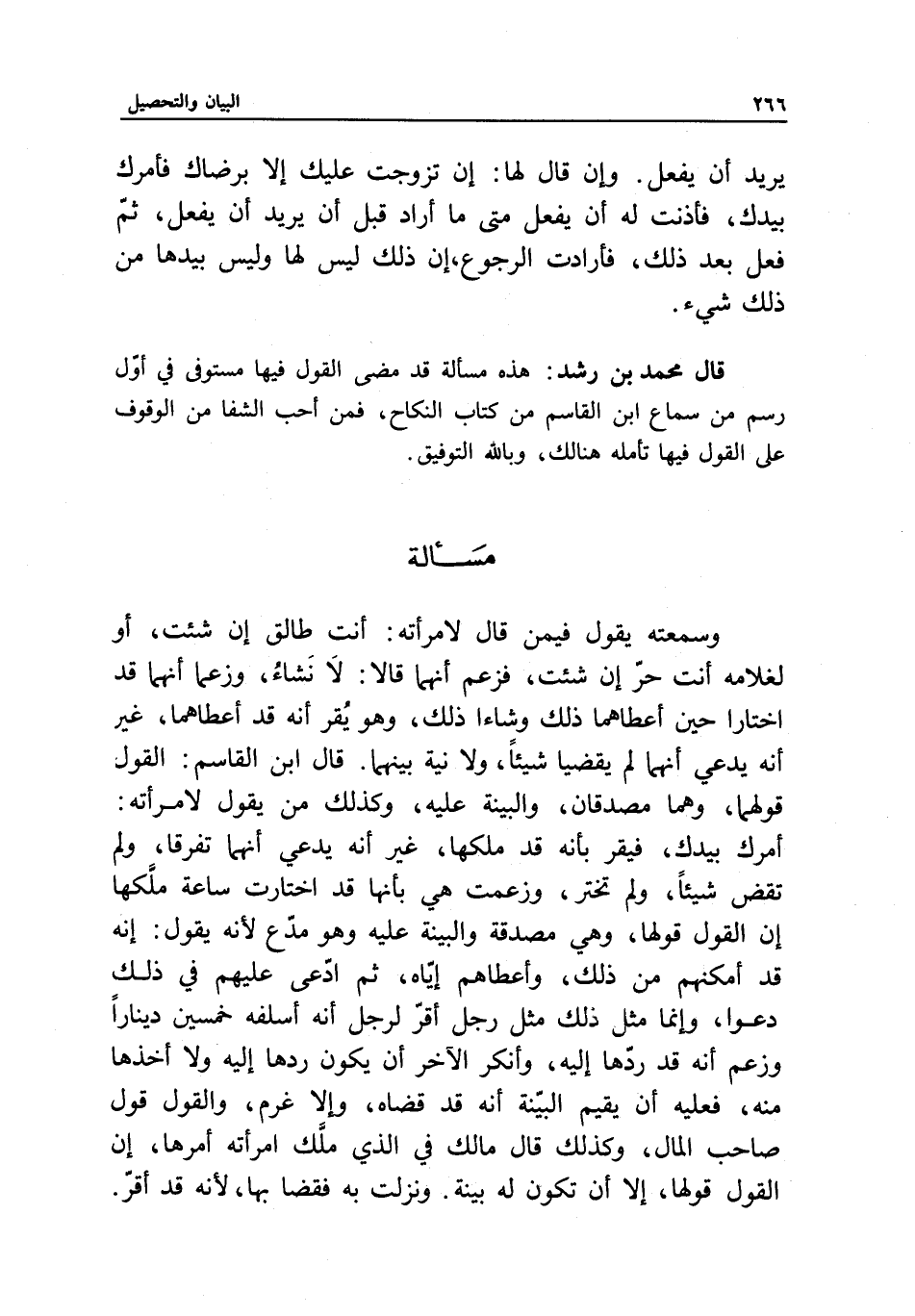 قال محمد بن رشد: هذه مسألة قد مضى القول فيها مستوفى في أول رسم من سماع ابن القاسم من كتاب النكاح، فمن أحب الشفاء من الوقوف على القول فيها تأمله هنالك، وبالله التوفيق.