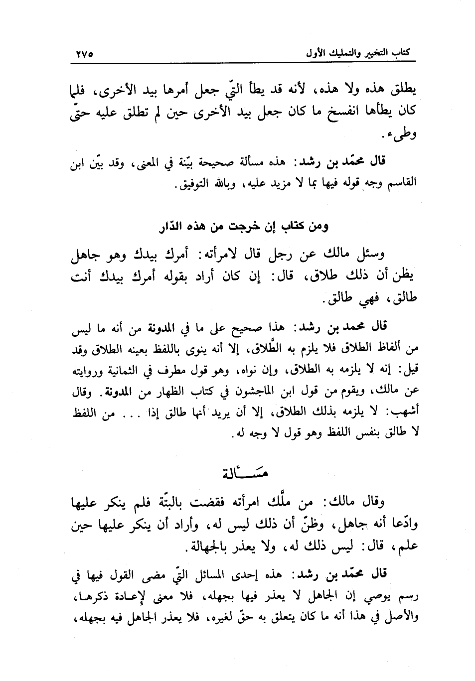 قال محمد بن رشد: هذه إحدى المسائل التي مضى القول فيها في رسم يوصي إن الجاهل لا يعذر فيها بجهله، فلا معنى لإعادة ذكرها، والأصل في هذا أنه ما كان يتعلق به حق لغيره، فلا يعذر الجاهل فيه بجهله،