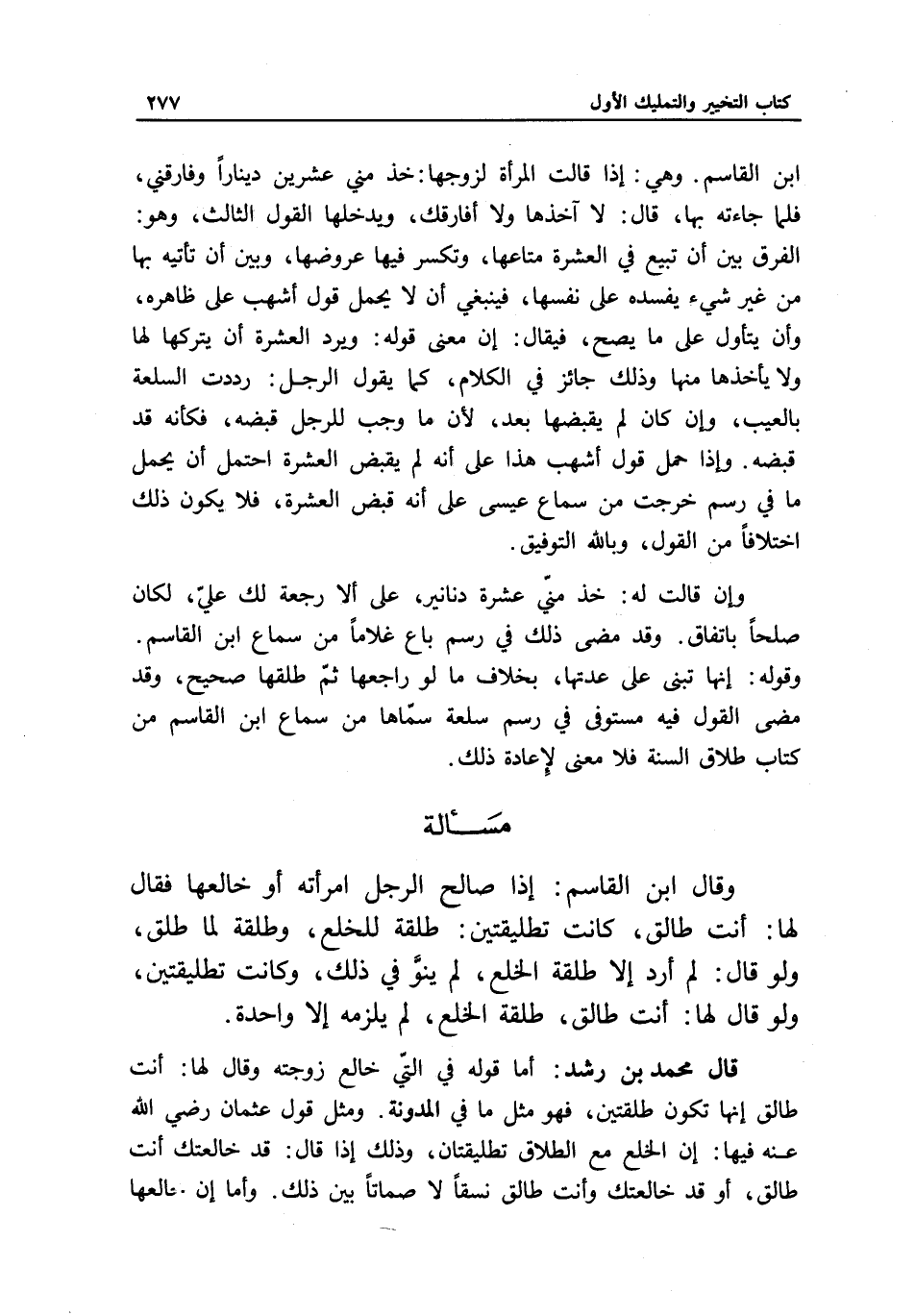 ابن القاسم. وهي: إذا قالت المرأة لزوجها: خذ مني عشرين دينارا وفارقني، فلما جاءته بها، قال: لا آخذها ولا أفارقك، ويدخلها القول الثالث، وهو: الفرق بين أن تبيع في العشرة متاعها، وتكسر فيها عروضها، وبين أن تأتيه بها من غير شيء يفسده على نفسها، فينبغي أن لا يحمل قول أشهب على ظاهره، وأن يتأول على ما يصح، فيقال: إن معنى قوله: ويرد العشرة أن يتركها لها ولا يأخذها منها وذلك جائز في الكلام، كما يقول الرجل: رددت السلعة بالعيب، وإن كان لم يقبضها بعد؛ لأن ما وجب للرجل قبضه، فكأنه قد قبضه. وإذا حمل قول أشهب هذا على أنه لم يقبض العشرة احتمل أن يحمل ما في رسم خرجت من سماع عيسى على أنه قبض العشرة، فلا يكون ذلك اختلافا من القول، وبالله التوفيق.