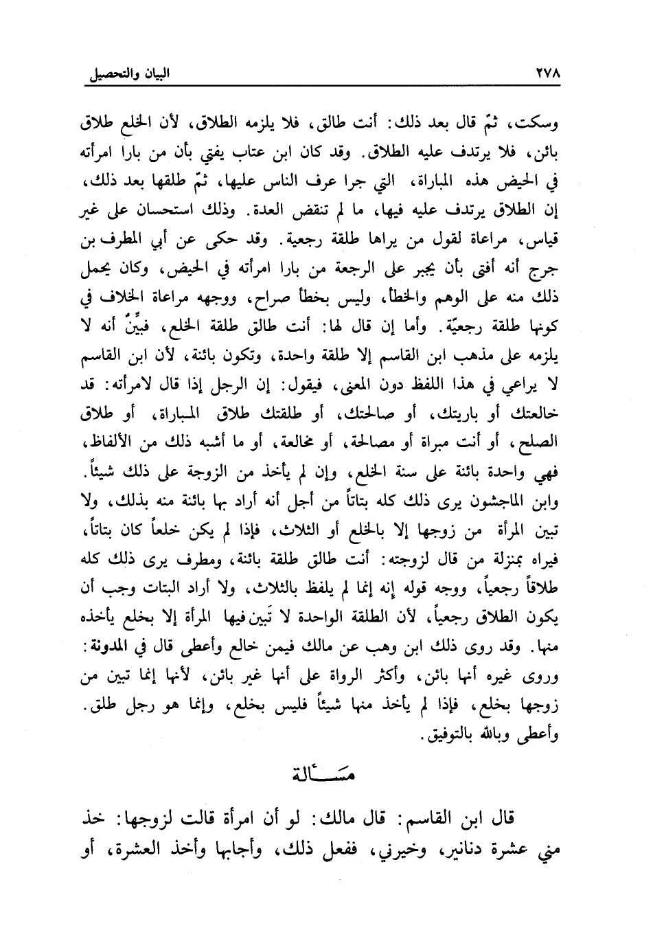 وسكت، ثم قال بعد ذلك: أنت طالق، فلا يلزمه الطلاق؛ لأن الخلع طلاق بائن، فلا يرتدف عليه الطلاق. وقد كان ابن عتاب يفتي بأن من بارا امرأته في الحيض هذه المباراة، التي جرا عرف الناس عليها، ثم طلقها بعد ذلك، إن الطلاق يرتدف عليه فيها، ما لم تنقض العدة.