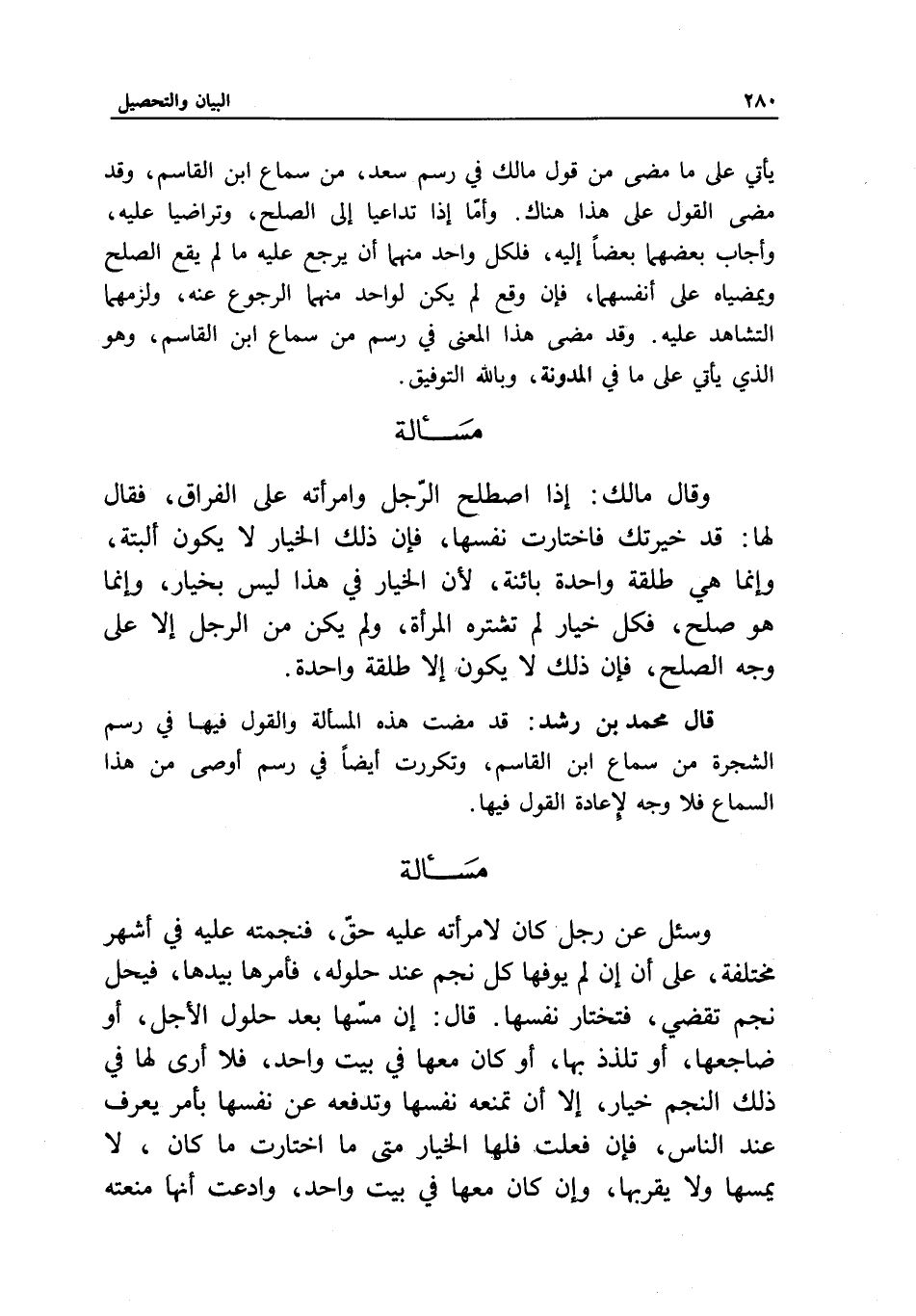 قال محمد بن رشد: قد مضت هذه المسألة والقول فيها في رسم الشجرة من سماع ابن القاسم، وتكررت أيضا في رسم أوصى من هذا السماع فلا وجه لإعادة القول فيها.