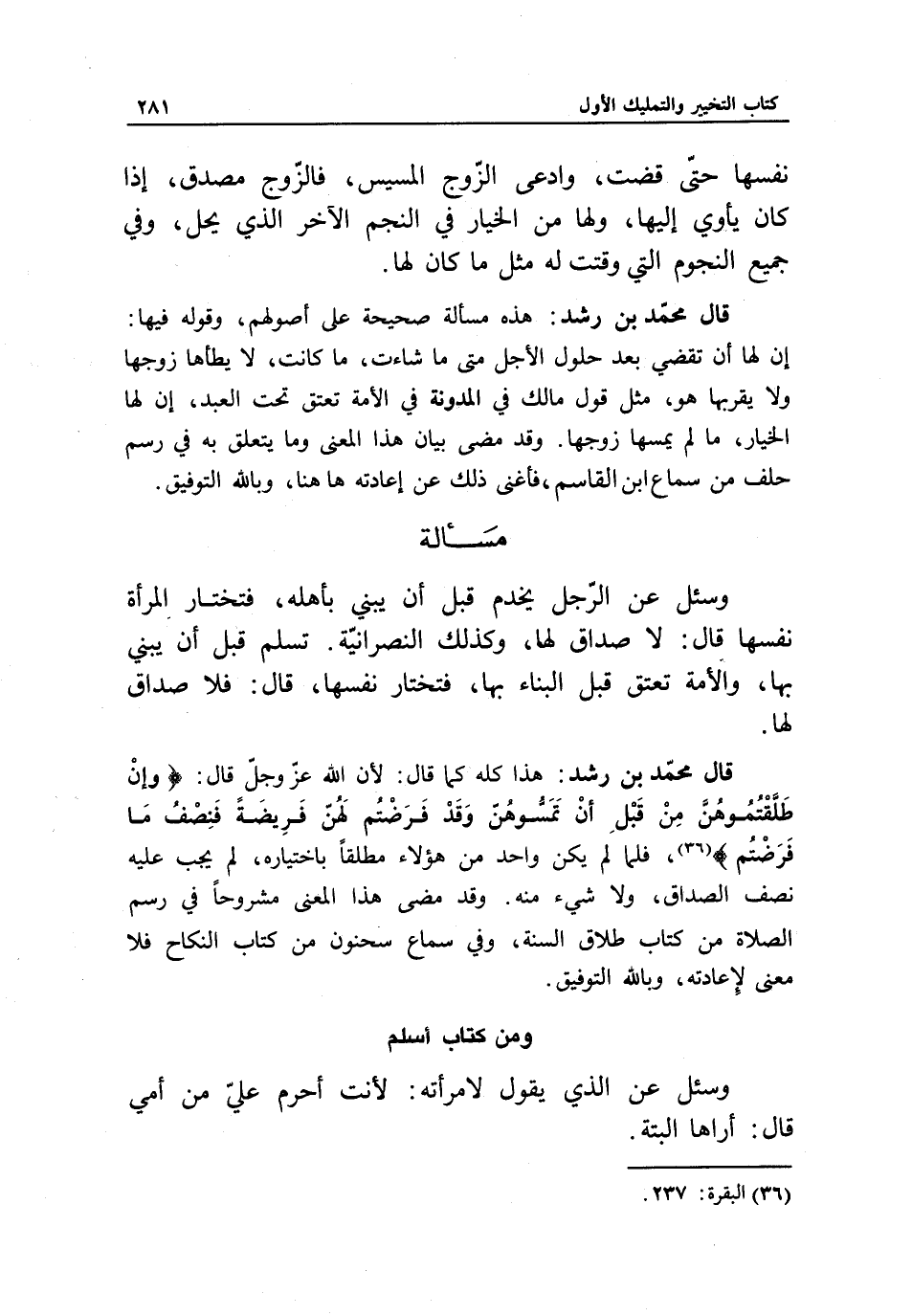 قال محمد بن رشد: هذا كله كما قال: لأن الله عز وجل قال: {وَإِنْ طَلَّقْتُمُوهُنَّ مِنْ قَبْلِ أَنْ تَمَسُّوهُنَّ وَقَدْ فَرَضْتُمْ لَهُنَّ فَرِيضَةً فَنِصْفُ مَا فَرَضْتُمْ} [البقرة: 237] ، فلما لم يكن واحد من هؤلاء مطلقا باختياره، لم يجب عليه نصف الصداق، ولا شيء منه. وقد مضى هذا المعنى مشروحا في رسم الصلاة من كتاب طلاق السنة، وفي سماع سحنون من كتاب النكاح فلا معنى لإعادته، وبالله التوفيق.