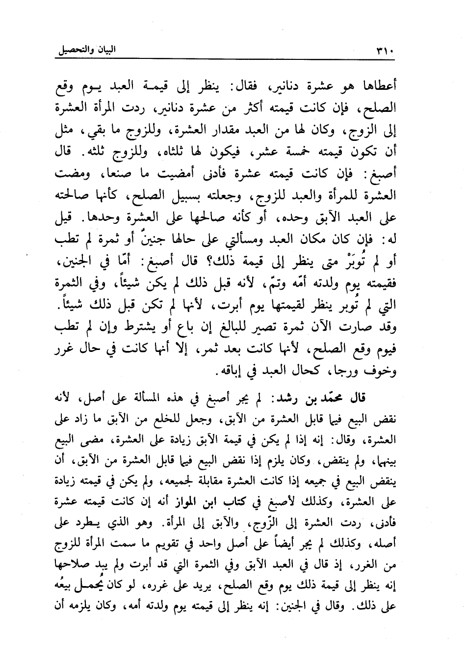 قال محمد بن رشد: لم يجر أصبغ في هذه المسألة على أصل؛ لأنه نقض البيع فيما قابل العشرة من الآبق، وجعل للخلع من الآبق ما زاد على العشرة، وقال: إنه إذا لم يكن في قيمة الآبق زيادة على العشرة، مضى البيع بينهما، ولم ينقض، وكان يلزم إذا نقض البيع فيما قابل العشرة من الآبق، أن ينقض البيع في جميعه إذا كانت العشرة مقابلة لجميعه، ولم يكن في قيمته زيادة على العشرة، وكذلك لأصبغ في كتاب ابن المواز أنه إن كانت قيمته عشرة فأدنى، ردت العشرة إلى الزوج، والآبق إلى المرأة.