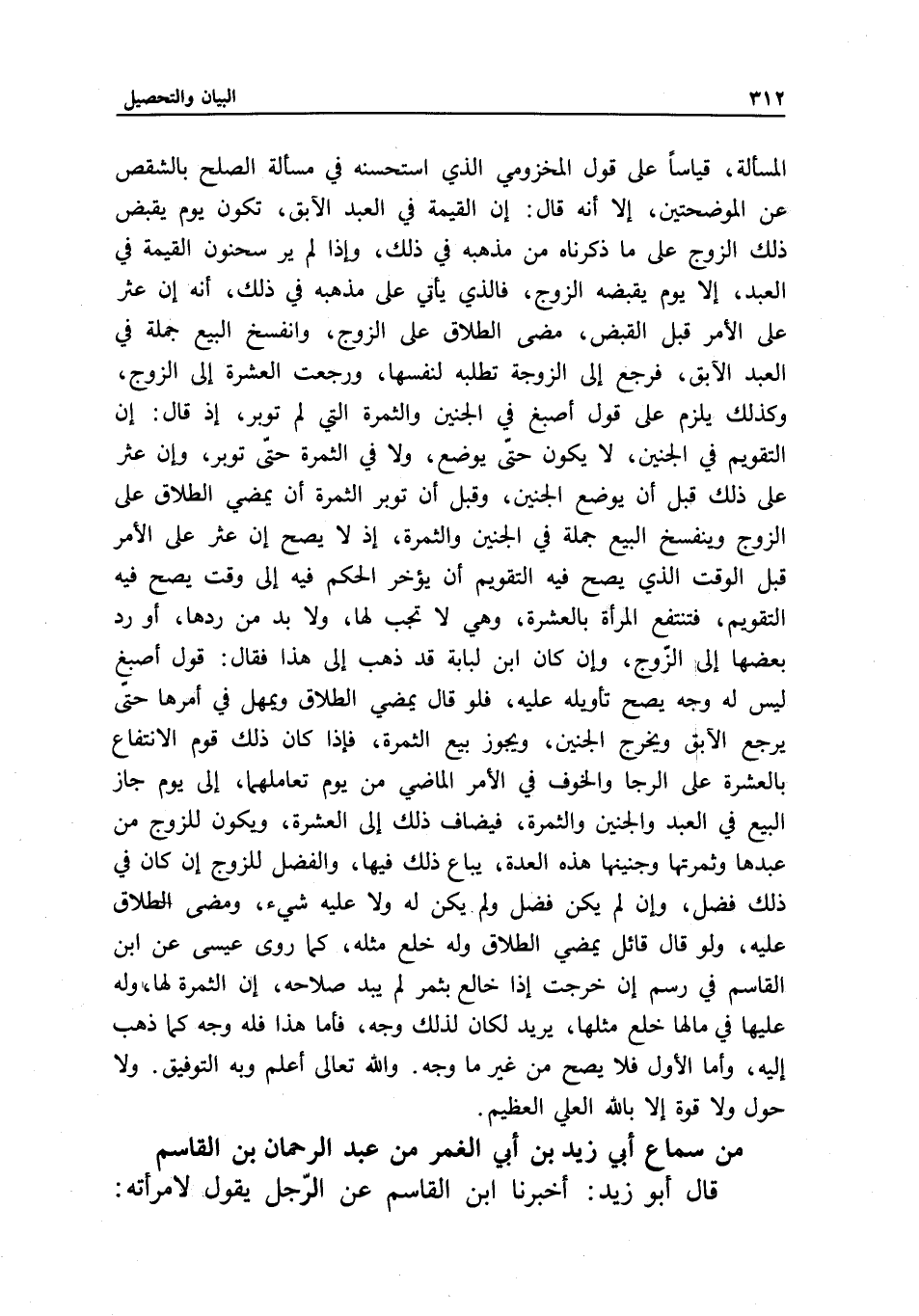 المسألة، قياسا على قول المخزومي الذي استحسنه في مسألة الصلح بالشقص عن الموضحتين، إلا أنه قال: إن القيمة في العبد الآبق، تكون يوم يقبض ذلك الزوج على ما ذكرناه من مذهبه في ذلك، وإذا لم ير سحنون القيمة في العبد، إلا يوم يقبضه الزوج، فالذي يأتي على مذهبه في ذلك، أنه إن عثر على الأمر قبل القبض، مضى الطلاق على الزوج وانفسخ البيع جملة في العبد الآبق، فرجع إلى الزوجة تطلبه لنفسها، ورجعت العشرة إلى الزوج، وكذلك يلزم على قول أصبغ في الجنين والثمرة التي لم توبر، إذ قال: إن التقويم في الجنين، لا يكون حتى يوضع، ولا في الثمرة حتى توبر، وإن عثر على ذلك قبل أن يوضع الجنين، وقبل أن توبر الثمرة أن يمضي الطلاق على الزوج وينفسخ البيع جملة في الجنين والثمرة، إذ لا يصح إن عثر على الأمر قبل الوقت الذي يصح فيه التقويم أن يؤخر الحكم فيه إلى وقت يصح فيه التقويم.