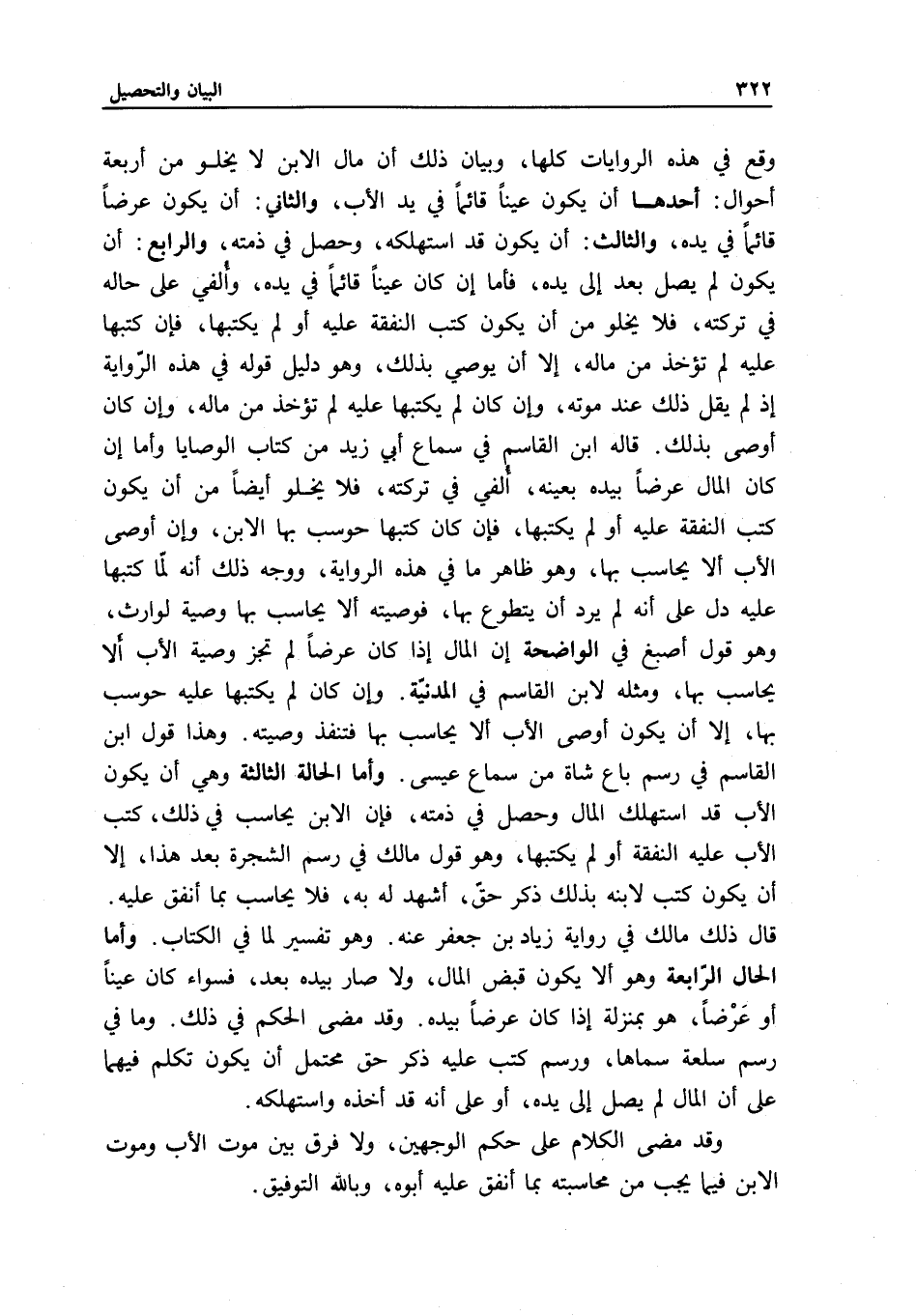 وأما الحالة الثالثة وهي أن يكون الأب قد استهلك المال وحصل في ذمته، فإن الابن يحاسب في ذلك، كتب الأب عليه النفقة أو لم يكتبها، وهو قول مالك في رسم الشجرة بعد هذا، إلا أن يكون كتب لابنه بذلك ذكر حق، أشهد له به، فلا يحاسب بما أنفق عليه. قال ذلك مالك في رواية زياد بن جعفر عنه. وهو تفسير لما في الكتاب.