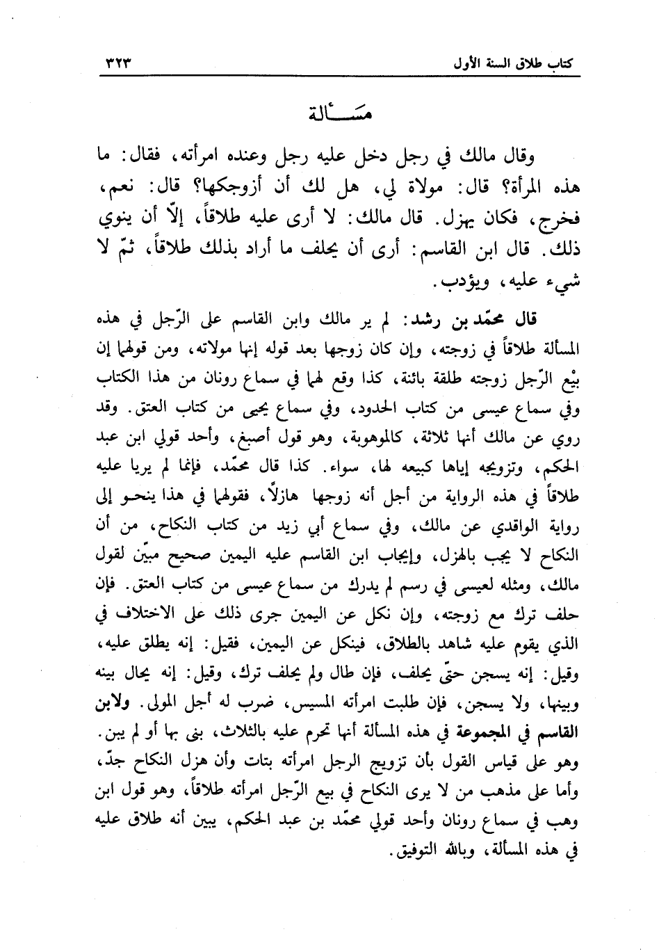 قال محمد بن رشد: لم ير مالك وابن القاسم على الرجل في هذه المسألة طلاقا في زوجته، وإن كان زوجها بعد قوله إنها مولاته، ومن قولهما إن بيع الرجل زوجته طلقة بائنة، كذا وقع لهما في سماع زونان من هذا الكتاب وفي سماع عيسى من كتاب الحدود، وفي سماع يحيى من كتاب العتق.
