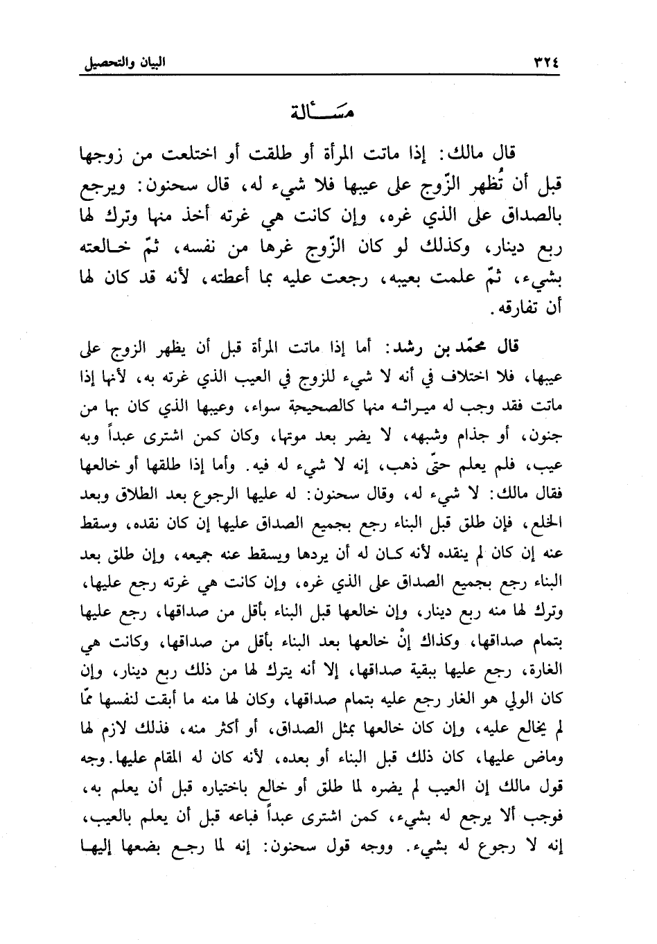 ووجه قول سحنون: إنه لما رجع بضعها إليها