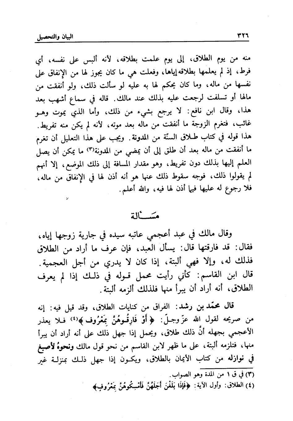 قال محمد بن رشد: الفراق من كنايات الطلاق، وقد قيل فيه: إنه من صريحه لقول الله عز وجل: {أَوْ فَارِقُوهُنَّ بِمَعْرُوفٍ} [الطلاق: 2] فلا يعذر الأعجمي بجهله أن ذلك طلاق، ويحمل إذا جهل ذلك على أنه أراد أن يبرأ منها، فتلزمه ألبتة، على ما ظهر لابن القاسم من نحو قول مالك ونحوه لأصبغ في نوازله من كتاب الأيمان بالطلاق، ويكون إذا جهل ذلك بمنزلة غير