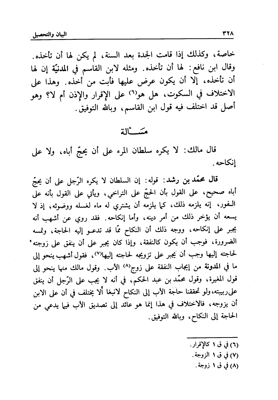 قال محمد بن رشد: قوله: إن السلطان لا يكره الرجل على أن يحج أباه صحيح، على القول بأن الحج على التراخي، ويأتي على القول بأنه على الفور، إنه يلزمه ذلك، كما يلزمه أن يشتري له ماء لغسله ووضوئه، إذ لا يسعه أن يؤخر ذلك من أمر دينه، وأما إنكاحه. فقد روي عن أشهب أنه يجبر على إنكاحه، ووجه ذلك أن النكاح مما قد تدعو إليه الحاجة، وتمسه الضرورة، فوجب أن يكون كالنفقة، وإذا كان يجبر على أن ينفق على زوجته؟ لحاجته إليها وجب أن يجبر على تزويجه لحاجته إليها، فقول أشهب ينحو إلى ما في المدونة من إيجاب النفقة على زوج الأب. وقول مالك منها ينحو إلى قول المغيرة، وقول محمد بن عبد الحكم، في أنه لا يجب على الرجل أن ينفق على ربيبته، ولو تحققنا حاجة الأب إلى النكاح لانبغى ألا يختلف في أن على الابن أن يزوجه، فالاختلاف في هذا إنما هو عائد إلى تصديق الأب فيما يدعي من الحاجة إلى النكاح، وبالله التوفيق.