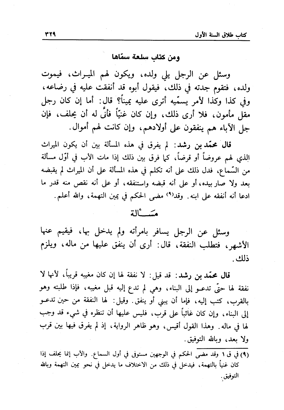 قال محمد بن رشد: لم يفرق في هذه المسألة بين أن يكون الميراث الذي لهم عروضا أو قرضا، كما فرق بين ذلك إذا مات الأب في أول مسألة من السماع، فدل ذلك على أنه تكلم في هذه المسألة على أن الميراث لم يقبضه بعد ولا صار بيده، أو على أنه قبضه واستنفقه، أو على أنه نقص منه قدر ما ادعى أنه أنفقه على ابنه. وقد مضى الحكم في يمين التهمة، والله أعلم.