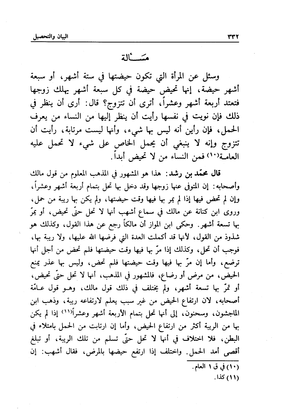 قال محمد بن رشد: هذا هو المشهور في المذهب المعلوم من قول مالك وأصحابه: إن المتوفى عنها زوجها وقد دخل بها تحل بتمام أربعة أشهر وعشرا، وإن لم تحض فيها إذا لم يمر بها فيها وقت حيضتها، ولم يكن بها ريبة من حمل، وروى ابن كنانة عن مالك في سماع أشهب أنها لا تحل حتى تحيض، أو يمر بها تسعة أشهر.