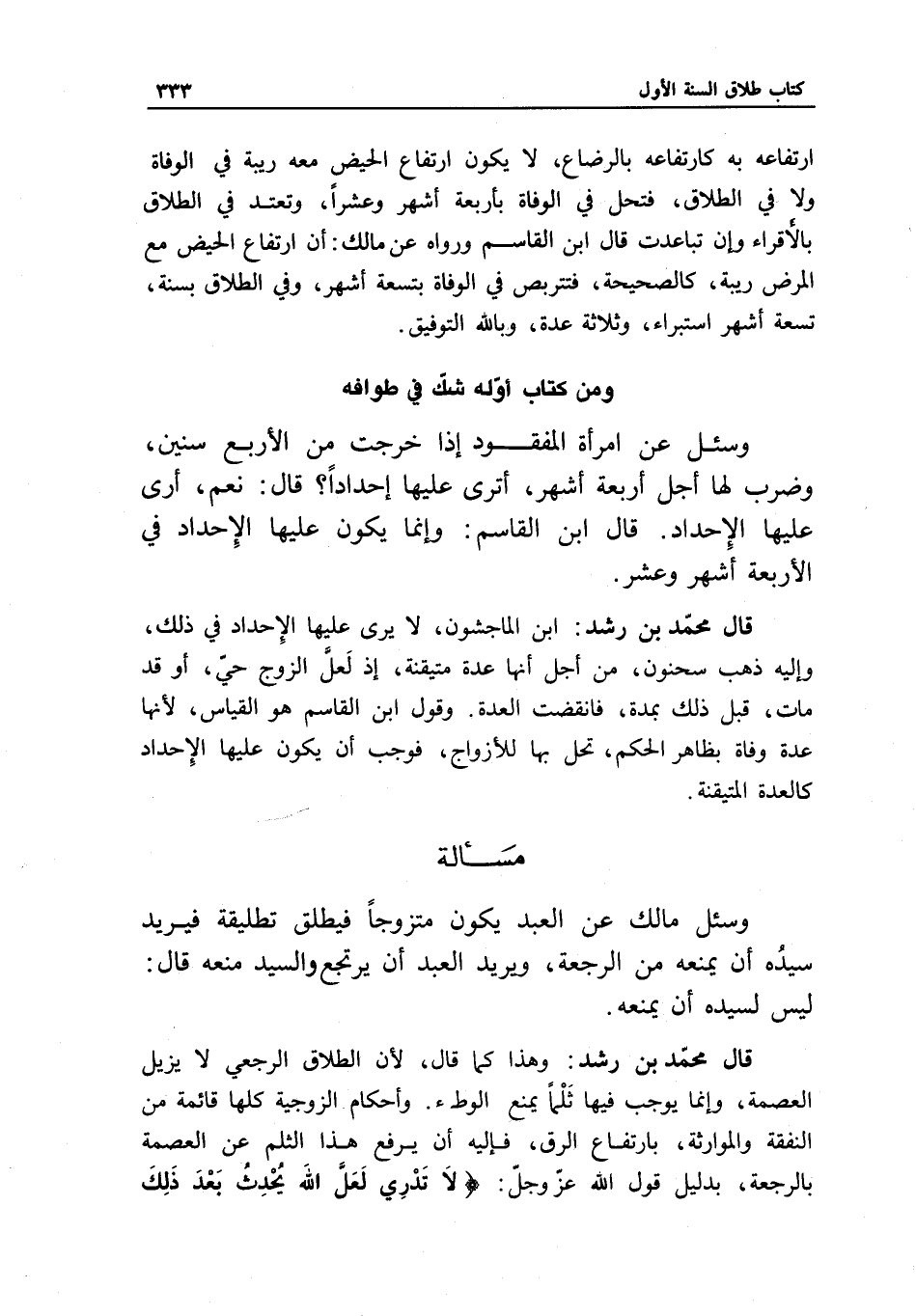 قال محمد بن رشد: وهذا كما قال؛ لأن الطلاق الرجعي لا يزيل العصمة، وإنما يوجب فيها ثلما يمنع الوطء. وأحكام الزوجية كلها قائمة من النفقة والموارثة، بارتفاع الرق، فإليه أن يرفع هذا الثلم عن العصمة بالرجعة، بدليل قول الله عز وجل: {لا تَدْرِي لَعَلَّ اللَّهَ يُحْدِثُ بَعْدَ ذَلِكَ أَمْرًا} [الطلاق: 1]