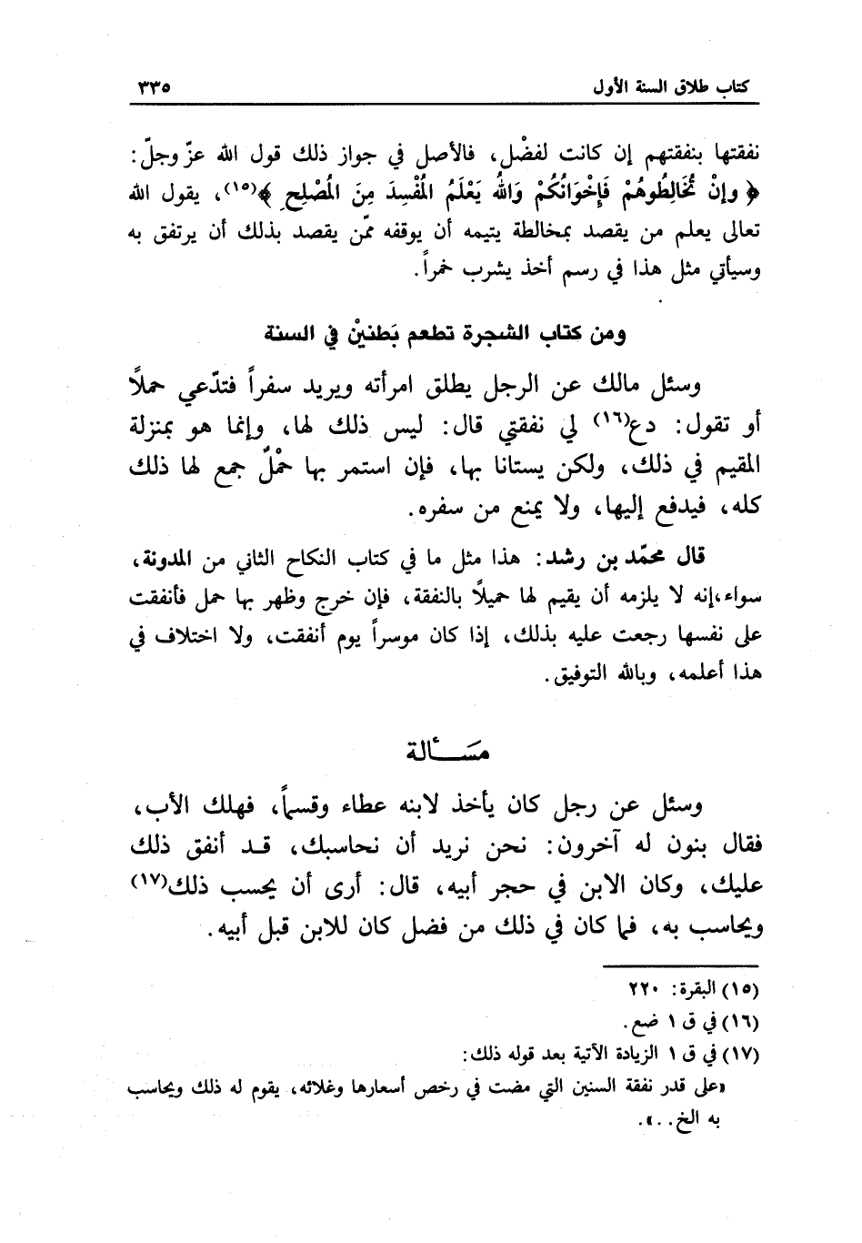 نفقتها بنفقتهم إن كانت لفضل، فالأصل في جواز ذلك قول الله عز وجل: {وَإِنْ تُخَالِطُوهُمْ فَإِخْوَانُكُمْ وَاللَّهُ يَعْلَمُ الْمُفْسِدَ مِنَ الْمُصْلِحِ} [البقرة: 220] ، يقول الله تعالى يعلم من يقصد بمخالطة يتيمه أن يوقفه ممن يقصد بذلك أن يرتفق به وسيأتي مثل هذا في رسم أخذ يشرب خمرا.