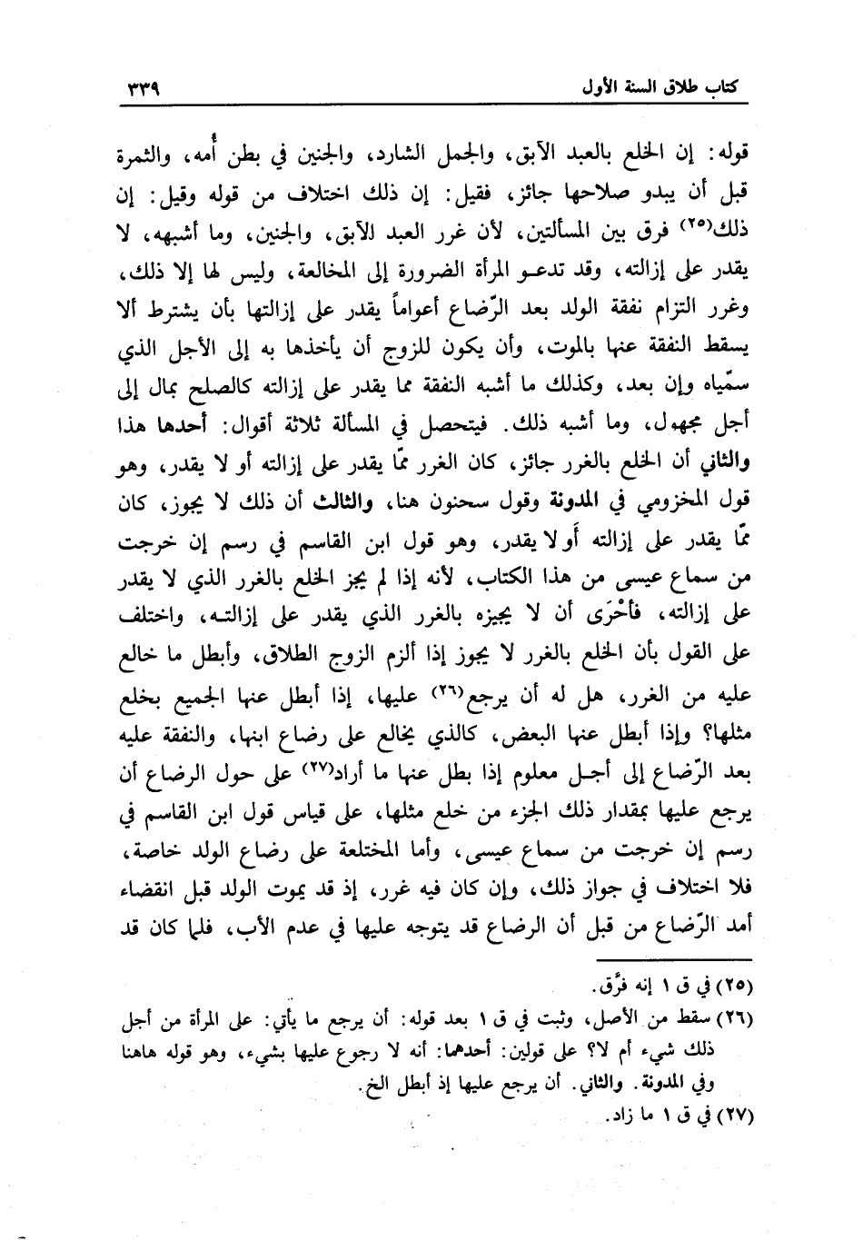 قوله: إن الخلع بالعبد الآبق، والجمل الشارد، والجنين في بطن أمه، والثمرة قبل أن يبدو صلاحها جائز، فقيل: إن ذلك اختلاف من قوله وقيل: إن ذلك فرق بين المسألتين؛ لأن غرر العبد الآبق، والجنين، وما أشبهه، لا يقدر على إزالته، وقد تدعو المرأة الضرورة إلى المخالعة، وليس لها إلا ذلك، وغرر التزام نفقة الولد بعد الرضاع أعواما يقدر على إزالتها بأن يشترط ألا يسقط النفقة عنها بالموت، وأن يكون للزوج أن يأخذها به إلى الأجل الذي سمياه وإن بعد، وكذلك ما أشبه النفقة مما يقدر على إزالته كالصلح بمال إلى أجل مجهول، وما أشبه ذلك.