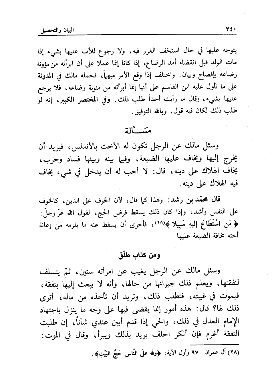 قال محمد بن رشد: وهذا كما قال؛ لأن الخوف على الدين، كالخوف على النفس وأشد، وإذا كان ذلك يسقط فرض الحج، لقول الله عز وجل: {مَنِ اسْتَطَاعَ إِلَيْهِ سَبِيلا} [آل عمران: 97] ، فأحرى أن يسقط عنه ما يلزمه من إعانة أخته مخافة الضيعة عليها.
