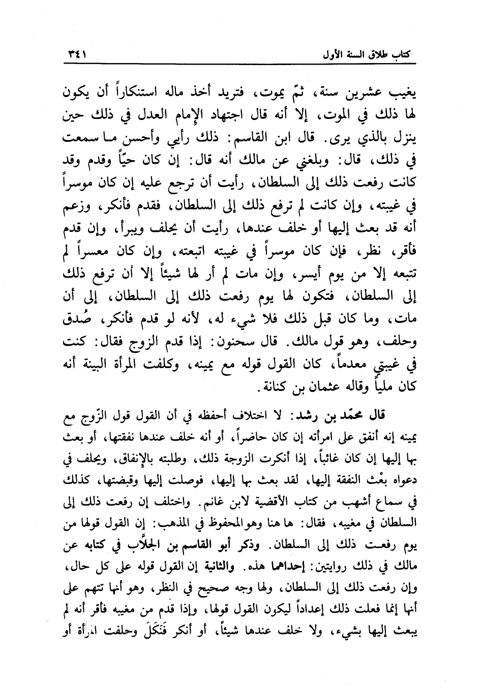 يغيب عشرين سنة، ثم يموت، فتريد أخذ ماله استنكارا أن يكون لها ذلك في الموت، إلا أنه قال اجتهاد الإمام العدل في ذلك حين ينزل بالذي يرى.