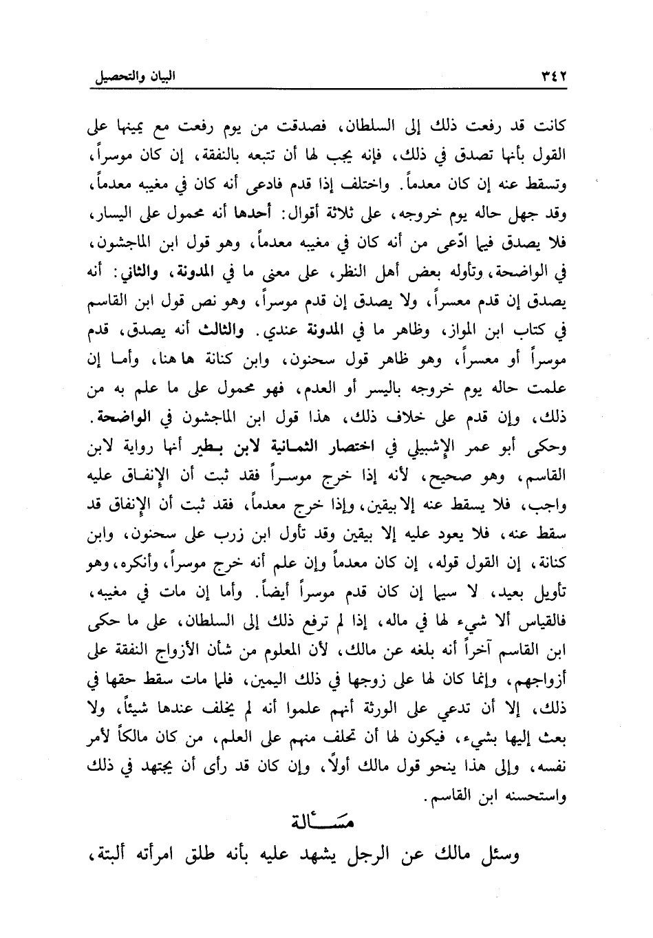 والثالث أنه يصدق، قدم موسرا أو معسرا، وهو ظاهر قول سحنون، وابن كنانة هاهنا، وأما إن علمت حاله يوم خروجه باليسر أو العدم، فهو محمول على ما علم به من ذلك، وإن قدم على خلاف ذلك، هذا قول ابن الماجشون في الواضحة.