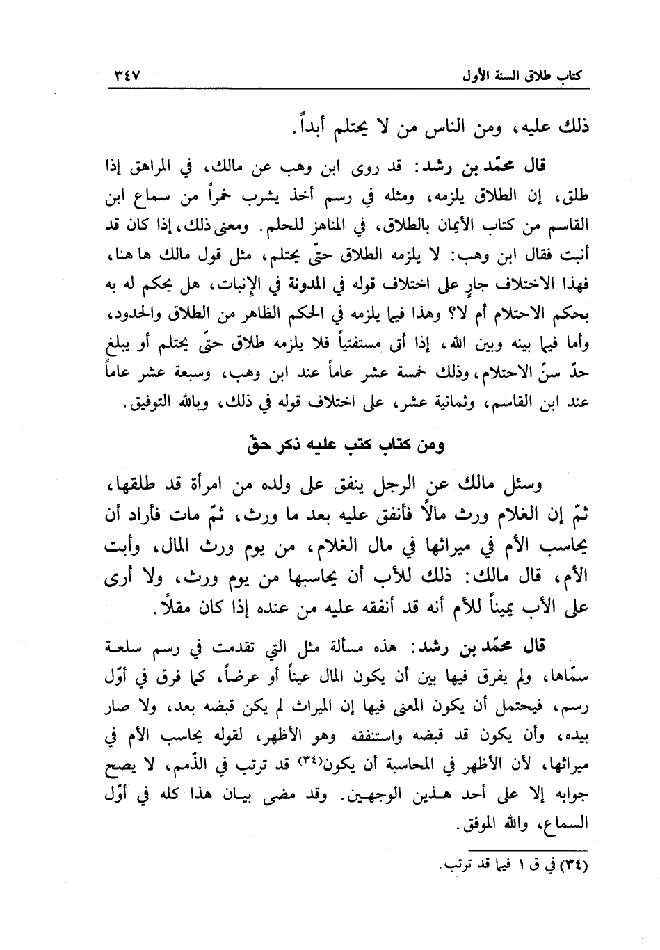 ومعنى ذلك، إذا كان قد أنبت فقال ابن وهب: لا يلزمه الطلاق حتى يحتلم، مثل قول مالك هاهنا، فهذا الاختلاف جار على اختلاف قوله في المدونة في الإنبات، هل يحكم له به بحكم الاحتلام أم لا؟ وهذا فيما يلزمه في الحكم الظاهر من الطلاق والحدود، وأما فيما بينه وبين الله، إذا أتى مستفتيا فلا يلزمه طلاق حتى يحتلم أو يبلغ حد سن الاحتلام، وذلك خمسة عشر عاما عند ابن وهب، وسبعة عشر عاما عند ابن القاسم، وثمانية عشر، على اختلاف قوله في ذلك، وبالله التوفيق.