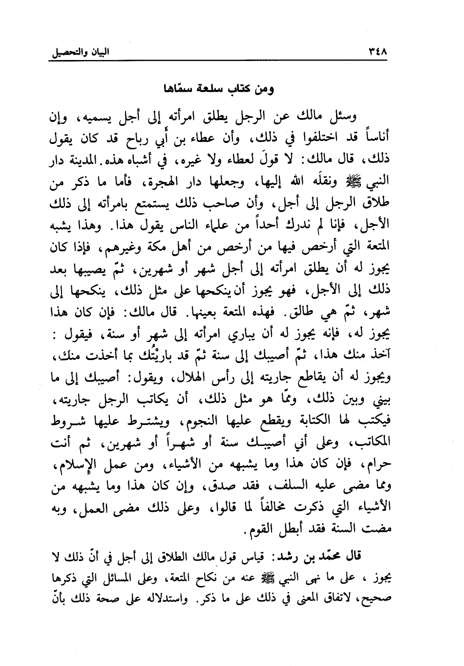 ومن كتاب سلعة سماها وسئل مالك عن الرجل يطلق امرأته إلى أجل يسميه، وإن أناسا قد اختلفوا في ذلك، وأن عطاء بن أبي رباح قد كان يقول ذلك، قال مالك: لا قول لعطاء ولا غيره، في أشباه هذه. المدينة دار النبي - صَلَّى اللَّهُ عَلَيْهِ وَسَلَّمَ - ونقله الله إليها، وجعلها دار الهجرة، فأما ما ذكر من طلاق الرجل إلى أجل، وأن صاحب ذلك يستمتع بامرأته إلى ذلك الأجل، فإنا لم ندرك أحدا من علماء الناس يقول هذا. وهذا يشبه المتعة التي أرخص فيها من أرخص من أهل مكة وغيرهم، فإذا كان يجوز له أن يطلق امرأته إلى أجل شهر أو شهرين، ثم يصيبها بعد ذلك إلى الأجل، فهو يجوز أن ينكحها على مثل ذلك، ينكحها إلى شهر، ثم هي طالق. فهذه المتعة بعينها.