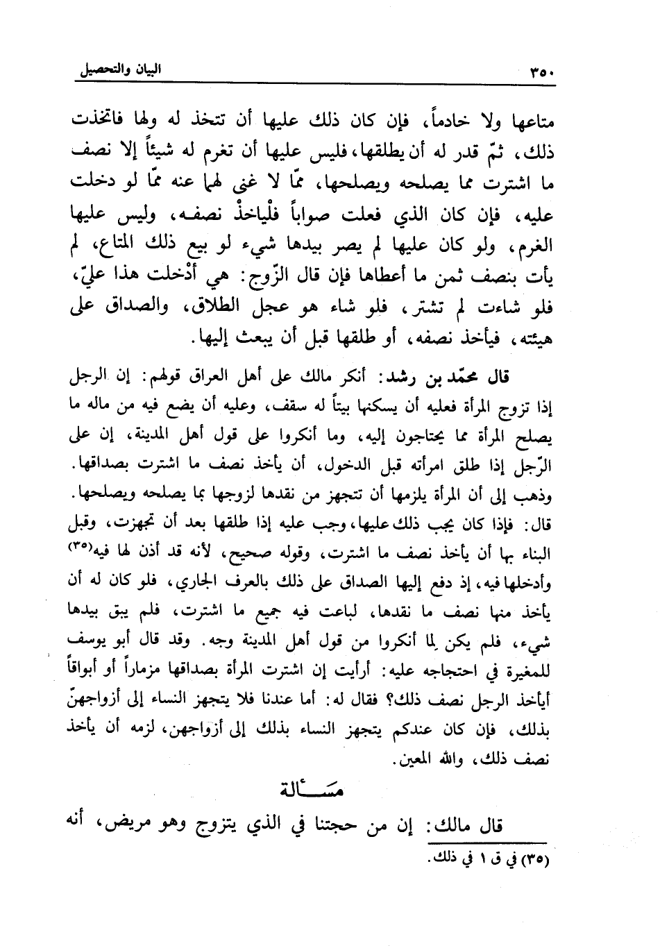 قال محمد بن رشد: أنكر مالك على أهل العراق قولهم: إن الرجل إذا تزوج المرأة فعليه أن يسكنها بيتا له سقف، وعليه أن يضع فيه من ماله ما يصلح المرأة مما يحتاجون إليه، وما أنكروا على قول أهل المدينة، إن على الرجل إذا طلق امرأته قبل الدخول، أن يأخذ نصف ما اشترت بصداقها.