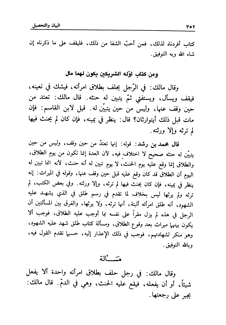 ومن كتاب أوله الشريكين يكون لهما مال. وقال مالك: في الرجل يحلف بطلاق امرأته، فيشك في تعينه، فيقف ويسأل، ويستفتي ثم يتبين له حنثه. قال مالك: تعتد من حين وقف عنها، وليس من حين يتبين له. قيل لابن القاسم: فإن مات قبل ذلك أيتوارثان؟ قال: ينظر في يمينه، فإن كان لم يحنث فيها لم ترثه وإلا ورثته.
