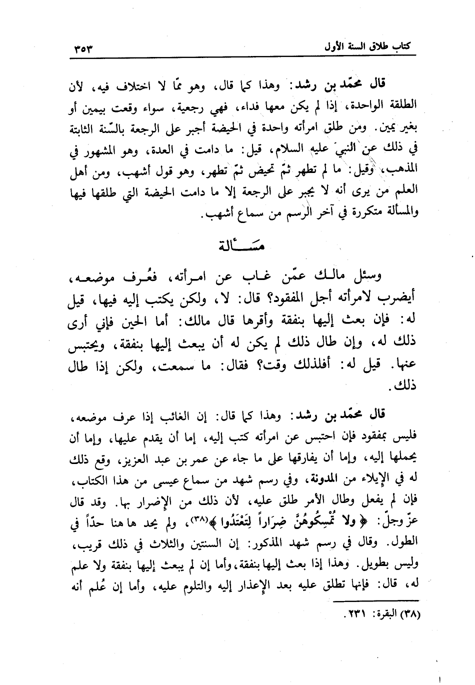 وقد قال عز وجل: {وَلا تُمْسِكُوهُنَّ ضِرَارًا لِتَعْتَدُوا} [البقرة: 231] ، ولم يحد هاهنا حدا في الطول. وقال في رسم شهد المذكور: إن السنتين والثلاث في ذلك قريب، وليس بطويل. وهذا إذا بعث إليها بنفقة، وأما إن لم يبعث إليها بنفقة ولا علم له، قال: فإنها تطلق عليه بعد الإعذار إليه والتلوم عليه، وأما إن علم أنه