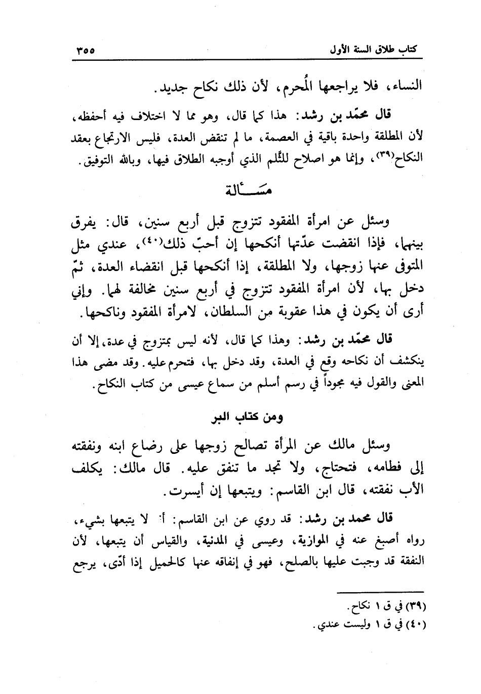 مسألة وسئل عن امرأة المفقود تتزوج قبل أربع سنين، قال: يفرق بينهما، فإذا انقضت عدتها أنكحها إن أحب ذلك، عندي مثل المتوفى عنها زوجها، ولا المطلقة، إذا أنكحها قبل انقضاء العدة، ثم دخل بها؛ لأن امرأة المفقود تتزوج في أربع سنين مخالفة لهما. وإني أرى أن يكون في هذا عقوبة من السلطان، لامرأة المفقود وناكحها.