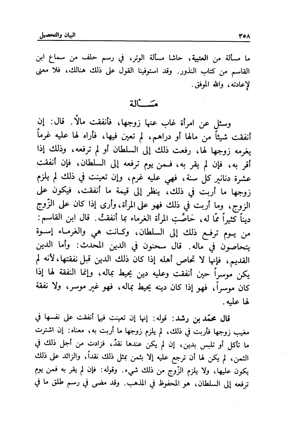 قال محمد بن رشد: قوله: إنها إن تعينت فيما أنفقت على نفسها في مغيب زوجها فأربت في ذلك، لم يلزم زوجها ما أربت به، معناه: إن اشترت ما تأكل أو تلبس بدين، إن لم يكن عندها نقد، فزادت من أجل ذلك في الثمن، لم يكن لها أن ترجع عليه إلا بثمن بمثل ذلك نقدا، والزائد على ذلك يكون عليها، ولا يلزم الزوج من ذلك شيء. وقوله: فإن لم يقر به فمن يوم ترفعه إلى السلطان، هو المحفوظ في المذهب. وقد مضى في رسم طلق ما في