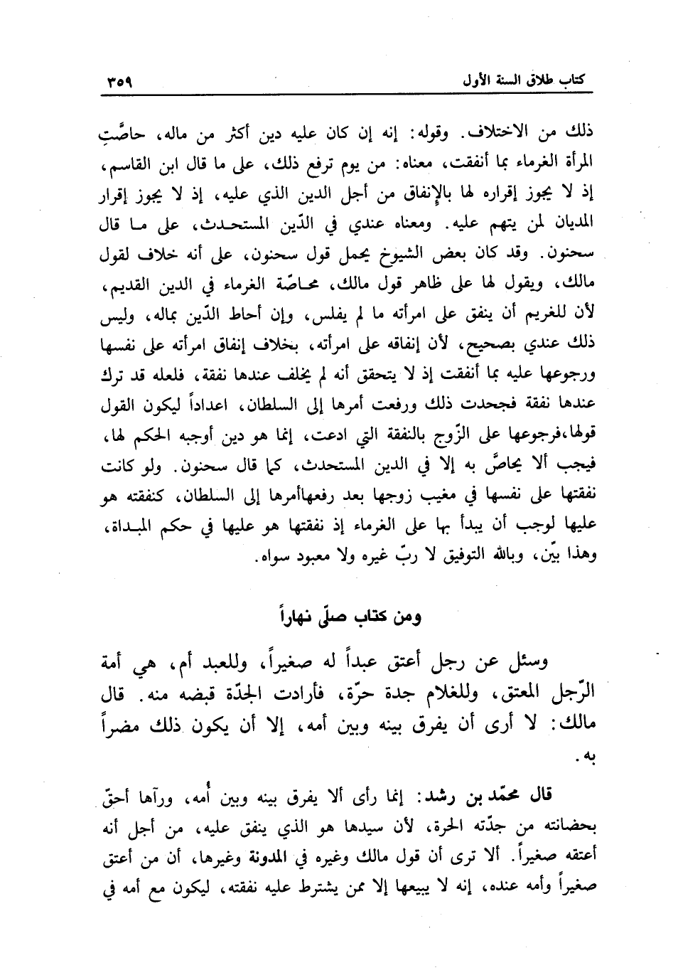 ومن كتاب صلى نهارا وسئل عن رجل أعتق عبدا له صغيرا، وللعبد أم، هي أمة الرجل المعتق، وللغلام جدة حرة، فأرادت الجدة قبضه منه. قال مالك: لا أرى أن يفرق بينه وبين أمه، إلا أن يكون ذلك مضرا به.