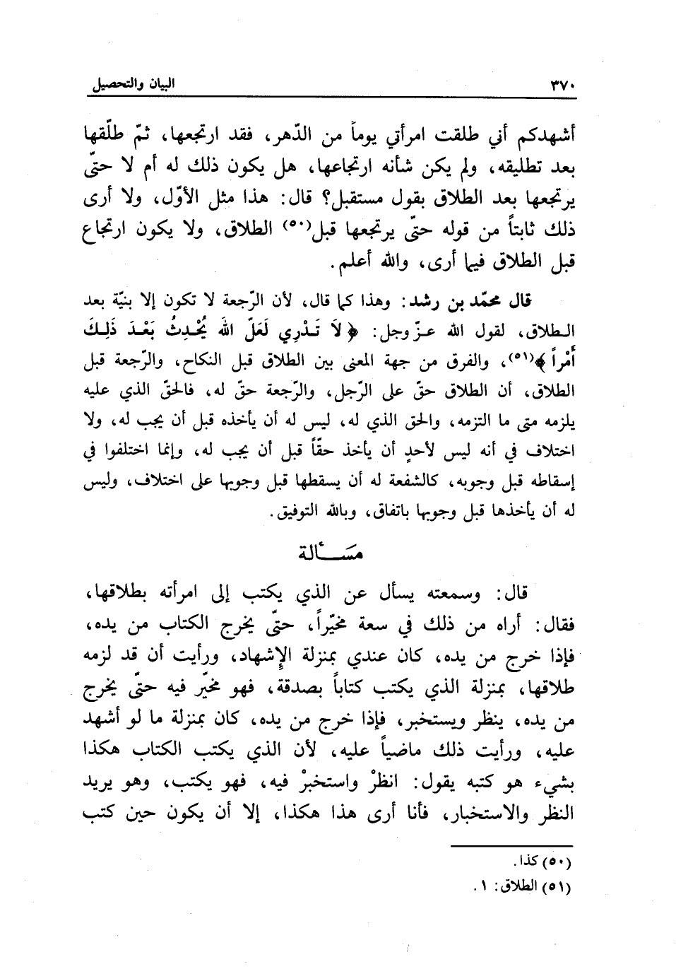 قال محمد بن رشد: وهذا كما قال؛ لأن الرجعة لا تكون إلا بنية بعد الطلاق، لقول الله عز وجل: {لا تَدْرِي لَعَلَّ اللَّهَ يُحْدِثُ بَعْدَ ذَلِكَ أَمْرًا} [الطلاق: 1] ، والفرق من جهة المعنى بين الطلاق قبل النكاح، والرجعة قبل الطلاق، أن الطلاق حق على الرجل، والرجعة حق له، فالحق الذي عليه يلزمه متى ما التزمه، والحق الذي له، ليس له أن يأخذه قبل أن يجب له، ولا اختلاف في أنه ليس لأحد أن يأخذ حقا قبل أن يجب له، وإنما اختلفوا في إسقاطه قبل وجوبه، كالشفعة له أن يسقطها قبل وجوبها على اختلاف، وليس له أن يأخذها قبل وجوبها باتفاق، وبالله التوفيق.