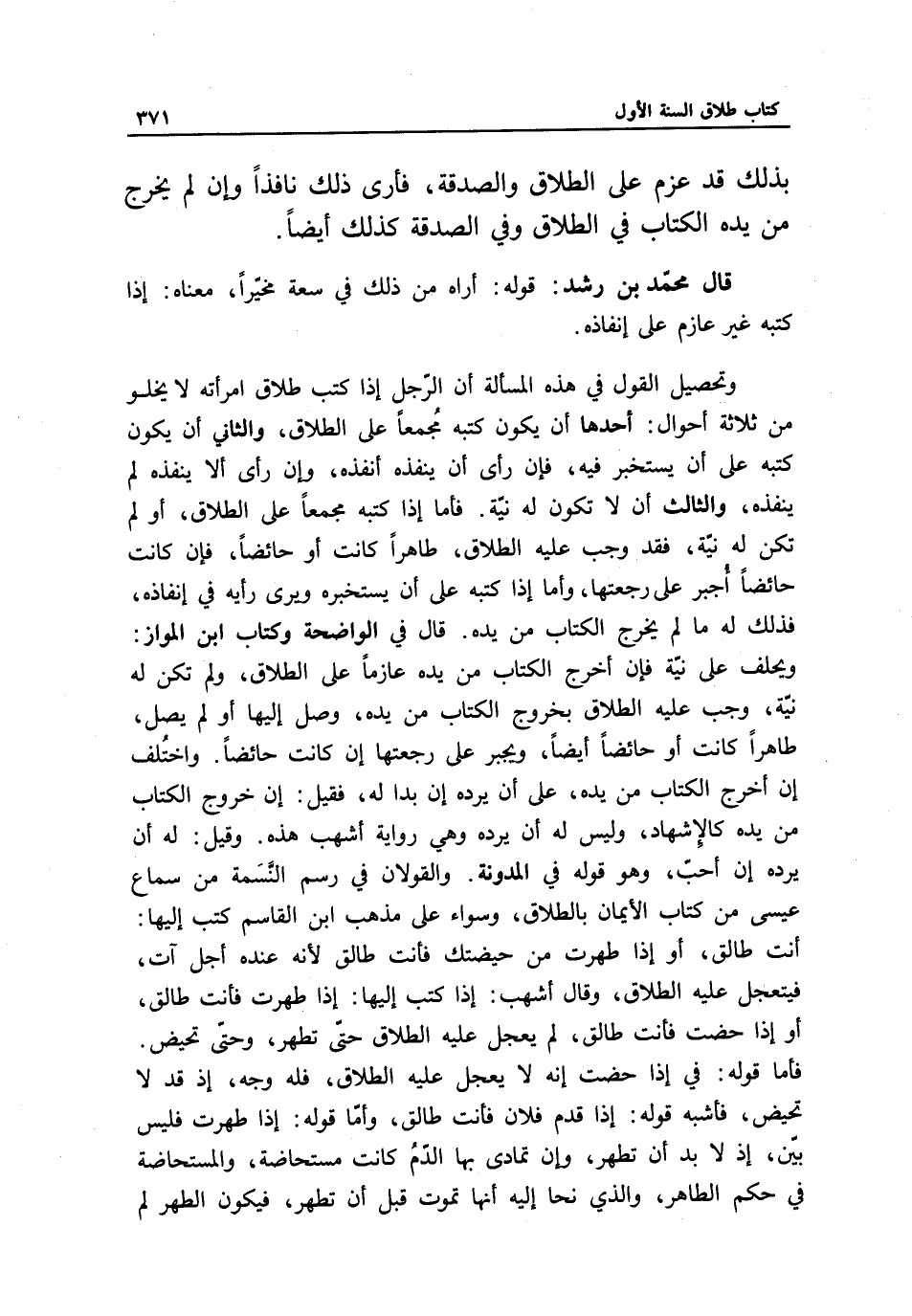 وتحصيل القول في هذه المسألة أن الرجل إذا كتب طلاق امرأته لا يخلو من ثلاثة أحوال: أحدها أن يكون كتبه مجمعا على الطلاق، والثاني أن يكون كتبه على أن يستخبر فيه، فإن رأى أن ينفذه أنفذه، وإن رأى ألا ينفذه لم ينفذه، والثالث أن لا تكون له نية. فأما إذا كتبه مجمعا على الطلاق، أو لم تكن له نية، فقد وجب عليه الطلاق، طاهرا كانت أو حائضا، فإن كانت حائضا أجبر على رجعتها، وأما إذا كتبه على أن يستخبره ويرى رأيه في إنفاذه، فذلك له ما لم يخرج الكتاب من يده. قال في الواضحة وكتاب ابن المواز: ويحلف على نية فإن أخرج الكتاب من يده عازما على الطلاق، ولم تكن له نية، وجب عليه الطلاق بخروج الكتاب من يده، وصل إليها أو لم يصل، طاهرا كانت أو حائضا أيضا، ويجبر على رجعتها إن كانت حائضا.