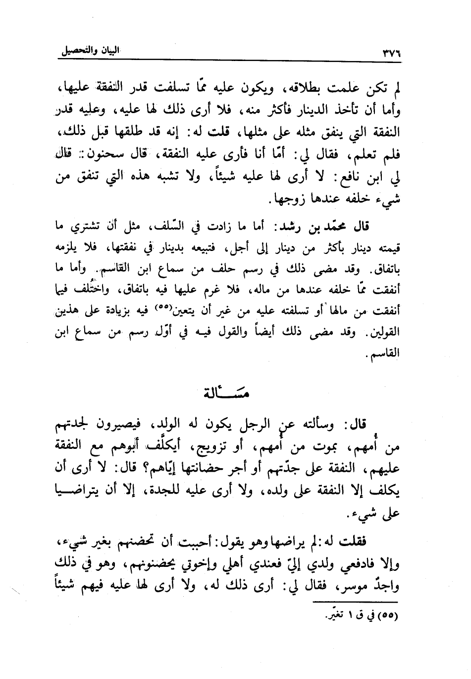مسألة قال: وسألته في الرجل يكون له الولد، فيصيرون لجدتهم من أمهم، بموت من أمهم، أو تزويج، أيكلف أبوهم مع النفقة عليهم، النفقة على جدتهم أو أجر حضانتها إياهم؟ قال: لا أرى أن يكلف إلا النفقة على ولده، ولا أرى عليه للجدة، إلا أن يتراضيا على شيء.