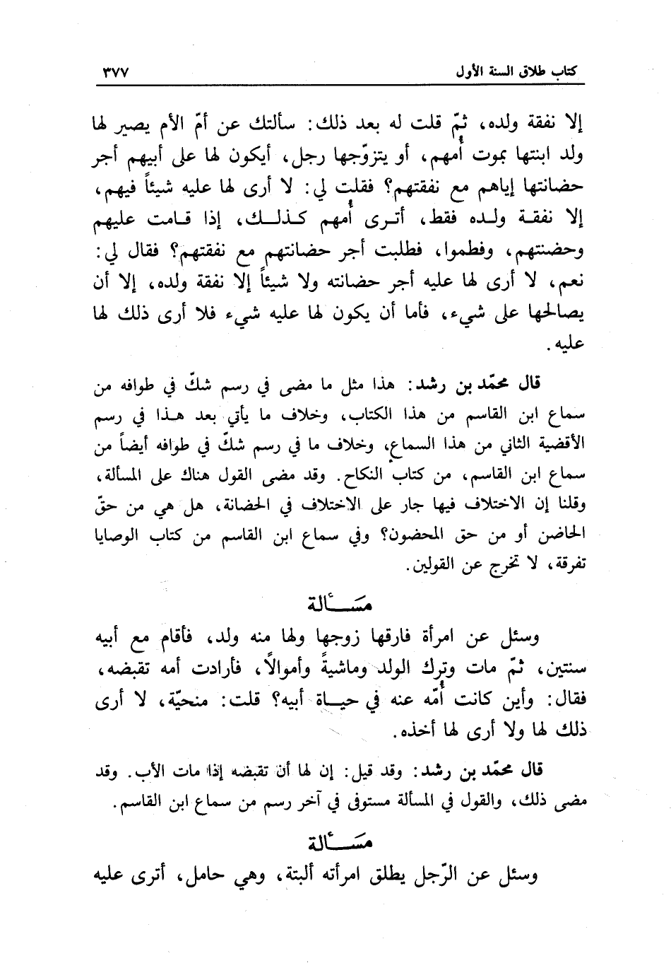 قال محمد بن رشد: هذا مثل ما مضى في رسم شك في طوافه من سماع ابن القاسم من هذا الكتاب، وخلاف ما يأتي بعد هذا في رسم الأقضية الثاني من هذا السماع، وخلاف ما في رسم شك في طوافه أيضا من سماع ابن القاسم، من كتاب النكاح. وقد مضى القول هناك على المسألة، وقلنا إن الاختلاف فيها جار على الاختلاف في الحضانة، هل هي من حق الحاضن أو من حق المحضون؟ وفي سماع ابن القاسم من كتاب الوصايا تفرقة، لا تخرج عن القولين.