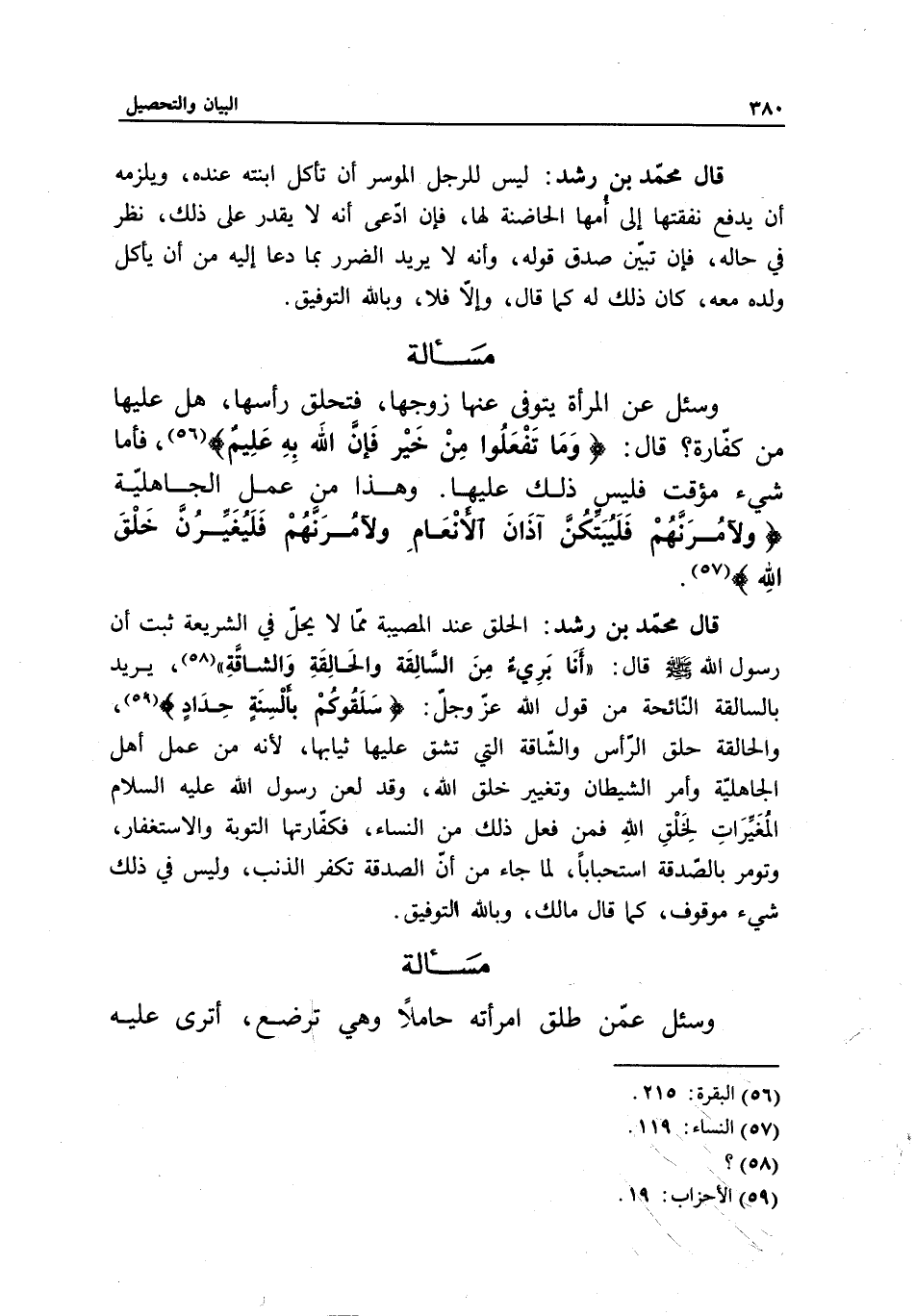 مسألة وسئل عن المرأة يتوفى عنها زوجها، فتحلق رأسها، هل عليها من كفارة؟ قال: {وَمَا تَفْعَلُوا مِنْ خَيْرٍ فَإِنَّ اللَّهَ بِهِ عَلِيمٌ} [البقرة: 215] ، فأما شيء مؤقت فليس ذلك عليها. وهذا من عمل الجاهلية {وَلآمُرَنَّهُمْ فَلَيُبَتِّكُنَّ آذَانَ الأَنْعَامِ وَلآمُرَنَّهُمْ فَلَيُغَيِّرُنَّ خَلْقَ اللَّهِ} [النساء: 119] .