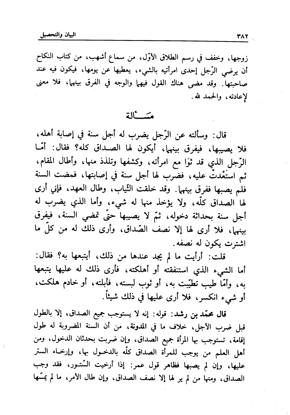 مسألة قال: وسألته عن الرجل يضرب له أجل سنة في إصابة أهله، فلا يصيبها، فيفرق بينهما، أيكون لها الصداق كله؟ فقال: أما الرجل الذي قد ثوا مع امرأته، وكشفها وتلذذ منها، وأطال المقام، ثم استعدت عليه، فضرب لها أجل سنة في إصابتها، فمضت السنة فلم يصبها ففرق بينهما.