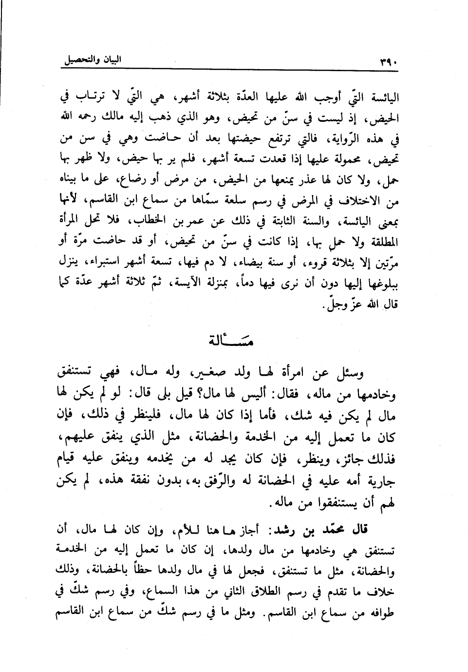 اليائسة التي أوجب الله عليها العدة بثلاثة أشهر، هي التي لا ترتاب في الحيض؛ إذ ليست في سن من تحيض، وهو الذي ذهب إليه مالك - رَحِمَهُ اللَّهُ - في هذه الرواية، فالتي ترتفع حيضتها بعد أن حاضت وهي في سن من تحيض، محمولة عليها إذا قعدت تسعة أشهر، فلم ير بها حيض، ولا ظهر بها حمل، ولا كان لها عذر يمنعها من الحيض، من مرض أو رضاع، على ما بيناه من الاختلاف في المرض في رسم سلعة سماها من سماع ابن القاسم؛ لأنها بمعنى اليائسة، والسنة الثابتة في ذلك عن عمر بن الخطاب، فلا تحل المرأة المطلقة ولا حمل بها، إذا كانت في سن من تحيض، أو قد حاضت مرة أو مرتين إلا بثلاثة قروء، أو سنة بيضاء، لا دم فيها، تسعة أشهر استبراء، ينزل ببلوغها إليها دون أن نرى فيها دما، بمنزلة الآيسة، ثم ثلاثة أشهر عدة كما قال الله عز وجل.