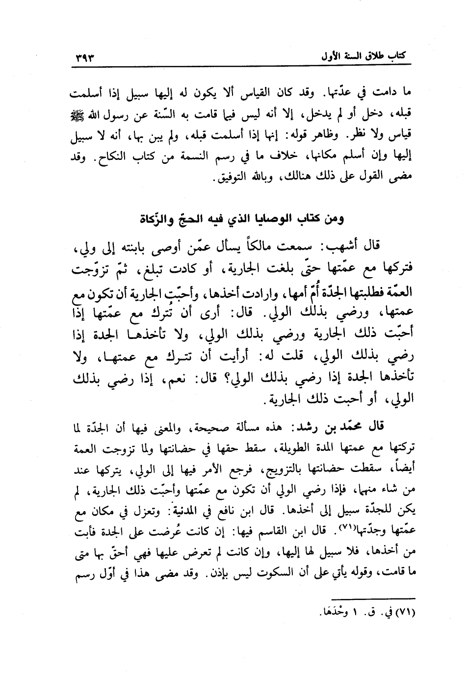 ومن كتاب الوصايا الذي فيه الحج والزكاة قال أشهب: سمعت مالكا يسأل عمن أوصى بابنته إلى ولي، فتركها مع عمتها حتى بلغت الجارية، أو كادت تبلغ، ثم تزوجت العمة فطلبتها الجدة أم أمها، وأرادت أخذها، وأحبت الجارية أن تكون مع عمتها، ورضي بذلك الولي. قال: أرى أن تترك مع عمتها إذا أحبت ذلك الجارية ورضي بذلك الولي، ولا تأخذها الجدة إذا رضي بذلك الولي، قلت له: أرأيت أن تترك مع عمتها، ولا تأخذها الجدة إذا رضي بذلك الولي؟ قال: نعم، إذا رضي بذلك الولي، أو أحبت ذلك الجارية.