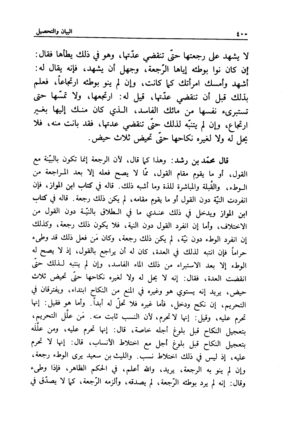 قال محمد بن رشد: وهذا كما قال؛ لأن الرجعة إنما تكون بالبينة مع القول، أو ما يقوم مقام القول، مما لا يصح فعله إلا بعد المراجعة من الوطء، والقبلة والمباشرة للذة وما أشبه ذلك. قاله في كتاب ابن المواز: فإن انفردت النية دون القول أو ما يقوم مقامه، لم يكن ذلك رجعة. قاله في كتاب ابن المواز ويدخل في ذلك عندي ما في الطلاق بالنية دون القول من الاختلاف، وأما إن انفرد القول دون النية، فلا يكون ذلك رجعة، وكذلك إن انفرد الوطء دون نية، لم يكن ذلك رجعة، وكان من فعل ذلك قد وطئ حراما فإن انتبه لذلك في العدة، كان له أن يراجع بالقول؛ إذ لا يصح له الوطء إلا بعد الاستبراء من ذلك الماء الفاسد، وإن لم ينتبه لذلك حتى انقضت العدة، فقال: إنه لا يحل له ولا لغيره نكاحها حتى تحيض ثلاث حيض، يريد أنه يستوي هو وغيره في المنع من النكاح ابتداء، ويفترقان في التحريم، إن نكح ودخل، فأما غيره فلا تحل له أبدا. وأما هو فقيل: إنها تحرم عليه، وقيل: إنها لا تحرم؛ لأن النسب ثابت منه. من علل التحريم، بتعجيل النكاح قبل بلوغ أجله خاصة، قال: إنها تحرم عليه، ومن علله بتعجيل النكاح قبل بلوغ أجل مع اختلاط الأنساب، قال: إنها لا تحرم عليه؛ إذ ليس في ذلك اختلاط نسب. والليث بن سعد يرى الوطء رجعة، وإن لم ينو به الرجعة، يريد، والله أعلم، في الحكم الظاهر، فإذا وطئ وقال: إنه لم يرد بوطئه الرجعة، لم يصدقه، وألزمه الرجعة، كما لا يصدق في