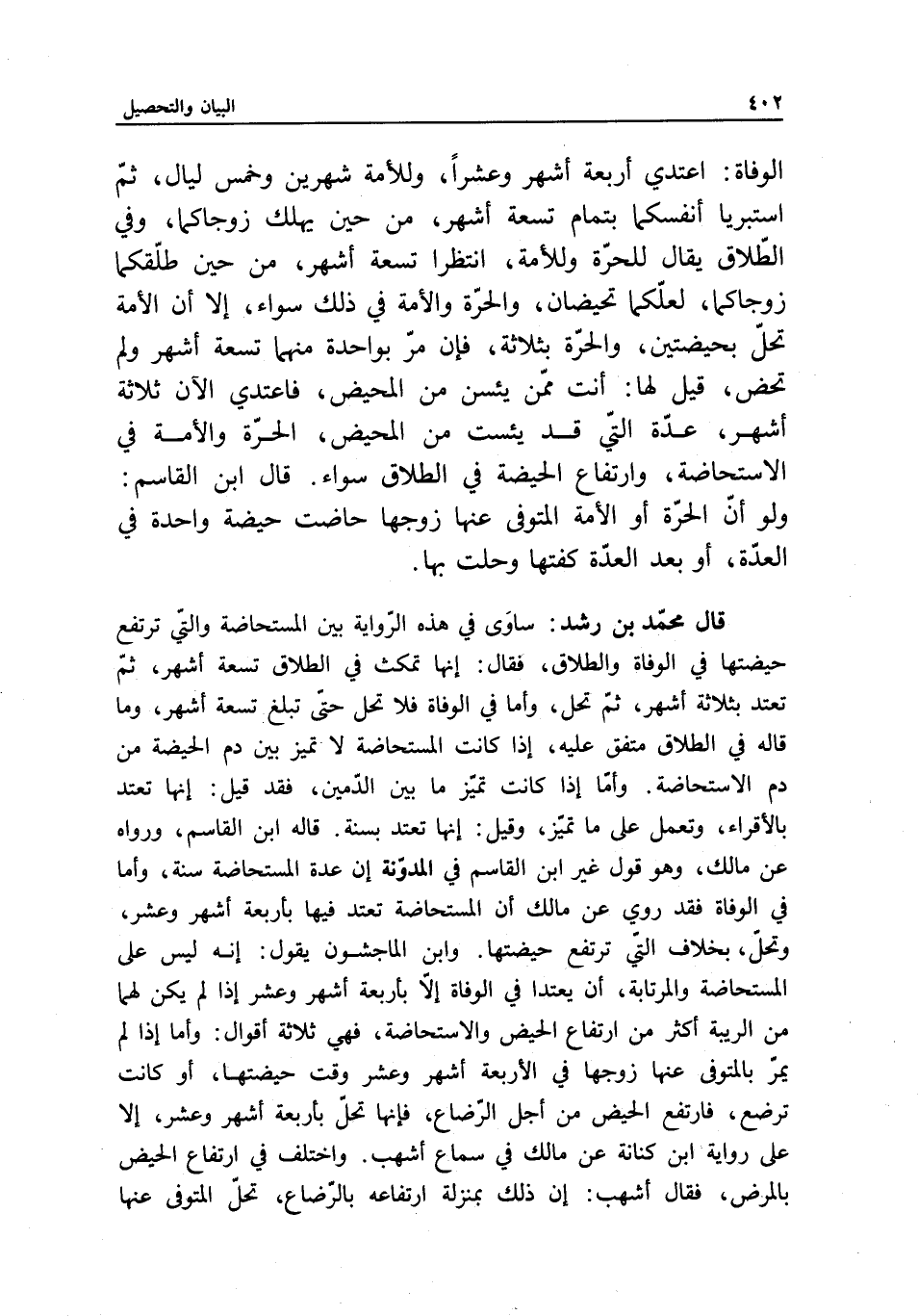 قال محمد بن رشد: ساوى في هذه الرواية بين المستحاضة والتي ترتفع حيضتها في الوفاة والطلاق، فقال: إنها تمكث في الطلاق تسعة أشهر، ثم تعتد بثلاثة أشهر، ثم تحل، وأما في الوفاة فلا تحل حتى تبلغ تسعة أشهر، وما قاله في الطلاق متفق عليه، إذا كانت المستحاضة لا تميز بين دم الحيضة من دم الاستحاضة. وأما إذا كانت تميز ما بين الدمين، فقد قيل: إنها تعتد بالأقراء، وتعمل على ما تميز، وقيل: إنها تعتد بسنة. قاله ابن القاسم، ورواه عن مالك، وهو قول غير ابن القاسم في المدونة إن عدة المستحاضة سنة، وأما في الوفاة فقد روي عن مالك أن المستحاضة تعتد فيها بأربعة أشهر وعشر، وتحل، بخلاف التي ترتفع حيضتها. وابن الماجشون يقول: إنه ليس على المستحاضة والمرتابة، أن يعتدا في الوفاة إلا بأربعة أشهر وعشر إذا لم يكن لهما من الريبة أكثر من ارتفاع الحيض والاستحاضة، فهي ثلاثة أقوال: وأما إذا لم يمر بالمتوفى عنها زوجها في الأربعة أشهر وعشر وقت حيضتها، أو كانت ترضع، فارتفع الحيض من أجل الرضاع، فإنها تحل بأربعة أشهر وعشر، إلا على رواية ابن كنانة عن مالك في سماع أشهب. واختلف في ارتفاع الحيض بالمرض، فقال أشهب: إن ذلك بمنزلة ارتفاعه بالرضاع، تحل المتوفى عنها