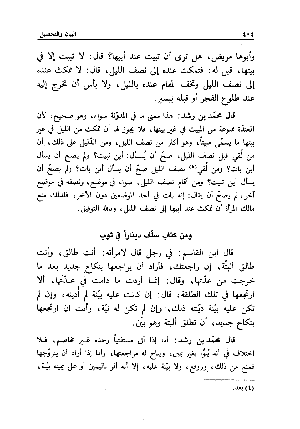 ومن كتاب سلف دينارا في ثوب قال ابن القاسم: في رجل قال لامرأته: أنت طالق، وأنت طالق ألبتة، إن راجعتك، فأراد أن يراجعها بنكاح جديد بعدما خرجت من عدتها، وقال: إنما أردت ما دامت في عدتها، ألا أرتجعها في تلك الطلقة، قال: إن كانت عليه بينة لم أدينه، وإن لم تكن عليه بينة دينته ذلك، وإن لم تكن له نية، رأيت أن أرتجعها بنكاح جديد، أن تطلق ألبتة وهو بين.