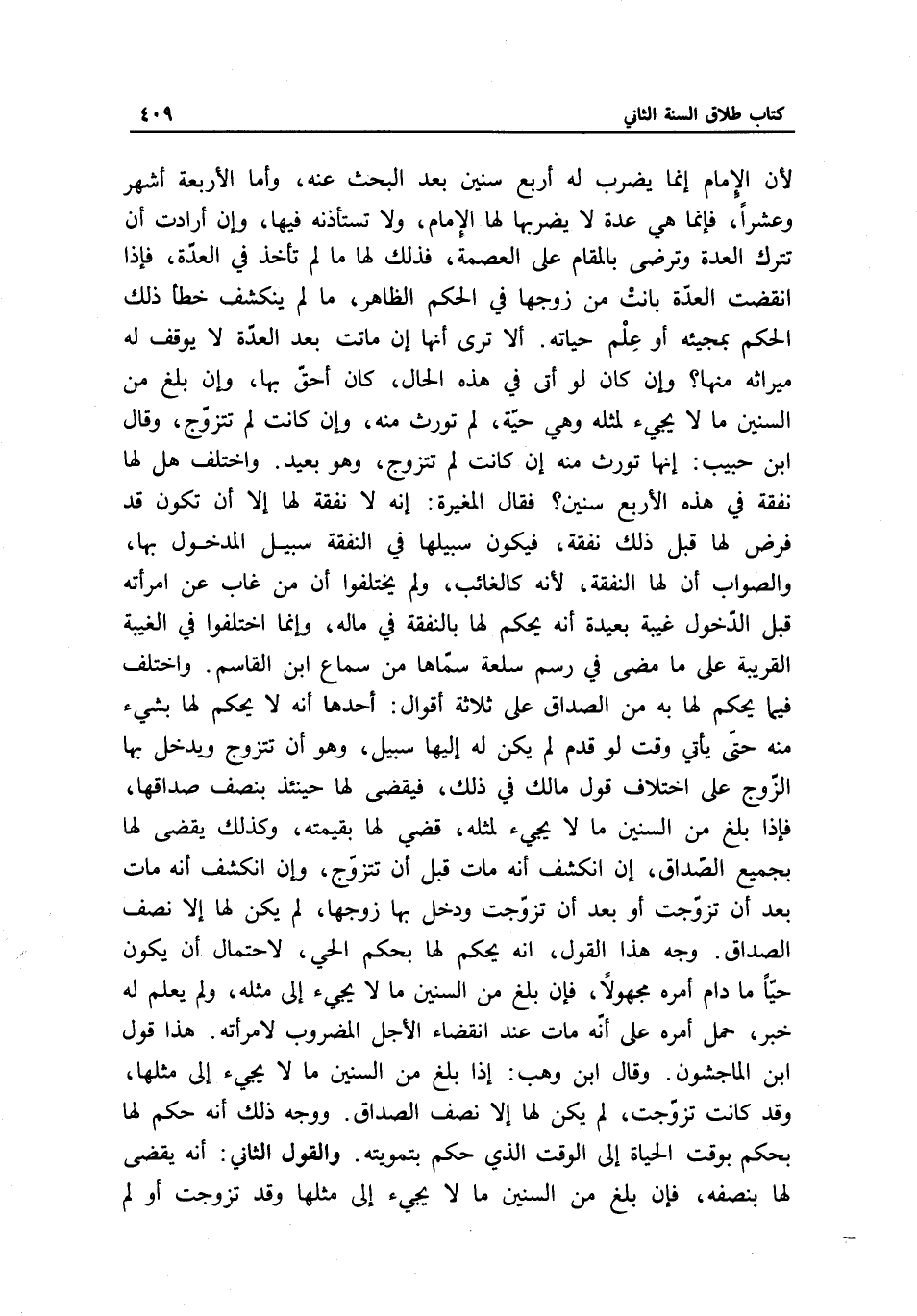 لأن الإمام إنما يضرب له أربع سنين بعد البحث عنه، وأما الأربعة أشهر وعشرا، فإنما هي عدة لا يضربها لها الإمام، ولا تستأذنه فيها، وإن أرادت أن تترك العدة وترضى بالمقام على العصمة، فذلك لها ما لم تأخذ في العدة، فإذا انقضت العدة بانت من زوجها في الحكم الظاهر، ما لم ينكشف خطأ ذلك الحكم بمجيئه أو علم حياته. ألا ترى أنها إن ماتت بعد العدة لا يوقف له ميراثه منها؟ وإن كان لو أتى في هذه الحال، كان أحق بها، وإن بلغ من السنين ما لا يجيء لمثله وهي حية، لم تورث منه، وإن كانت لم تتزوج، وقال ابن حبيب: إنها تورث منه إن كانت لم تتزوج، وهو بعيد. واختلف هل لها نفقة في هذه الأربع سنين؟ فقال المغيرة: إنه لا نفقة لها إلا أن تكون قد فرض لها قبل ذلك نفقة، فيكون سبيلها في النفقة سبيل المدخول بها، والصواب أن لها النفقة؛ لأنه كالغائب، ولم يختلفوا أن من غاب عن امرأته قبل الدخول غيبة بعيدة أنه يحكم لها بالنفقة في ماله، وإنما اختلفوا في الغيبة القريبة على ما مضى في رسم سلعة سماها من سماع ابن القاسم. واختلف فيما يحكم لها به من الصداق على ثلاثة أقوال: أحدها: أنه لا يحكم لها بشيء منه حتى يأتي وقت لو قدم لم يكن له إليها سبيل، وهو أن تتزوج ويدخل بها الزوج على اختلاف قول مالك في ذلك، فيقضى لها حينئذ بنصف صداقها، فإذا بلغ من السنين ما لا يجيء لمثله، قضي لها بقيمته، وكذلك يقضى لها بجميع الصداق، إن انكشف أنه مات قبل أن تتزوج، وإن انكشف أنه مات بعد أن تزوجت أو بعد أن تزوجت ودخل بها زوجها، لم يكن لها إلا نصف الصداق. وجه هذا القول، أنه يحكم لها بحكم الحي، لاحتمال أن يكون حيا ما دام أمره مجهولا، فإن بلغ من السنن ما لا يجيء إلى مثله، ولم يعلم له خبر، حمل أمره على أنه مات عند انقضاء الأجل المضروب لامرأته. هذا قول ابن الماجشون. وقال ابن وهب: إذا بلغ من السنين ما لا يجيء إلى مثلها، وقد كانت تزوجت، لم يكن لها إلا نصف الصداق. ووجه ذلك أنه حكم لها بحكم بوقت الحياة إلى الوقت الذي حكم بتمويته. والقول الثاني: أنه يقضى لها بنصفه، فإن بلغ من السنين ما لا يجيء إلى مثلها وقد تزوجت أو لم