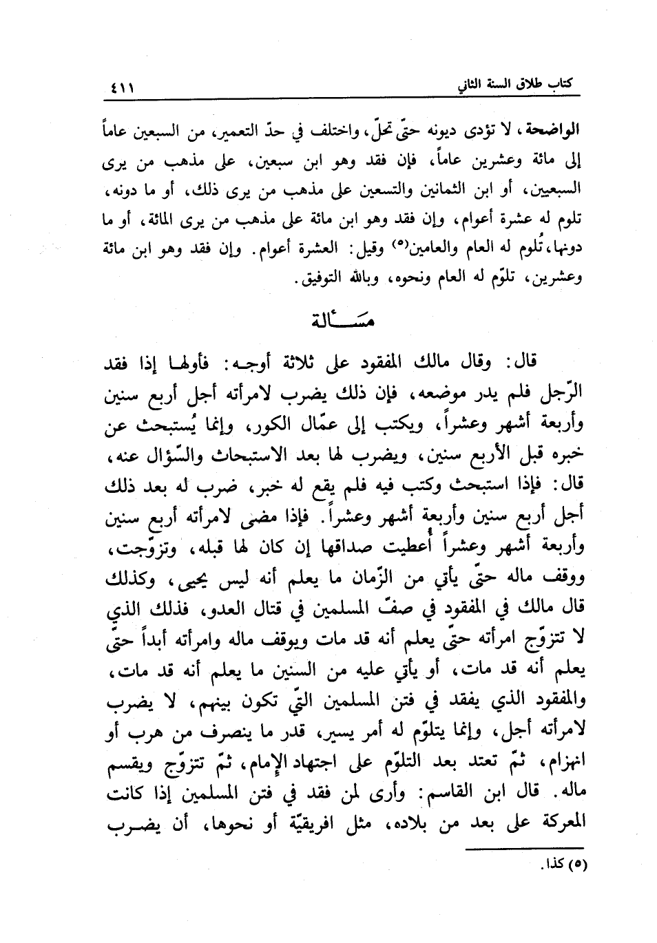 مسألة قال: وقال مالك المفقود على ثلاثة أوجه: فأولها: إذا فقد الرجل فلم يدر موضعه، فإن ذلك يضرب لامرأته أجل أربع سنين وأربعة أشهر وعشرا، ويكتب إلى عمال الكور، وإنما يستبحث عن خبره قبل الأربع سنين، ويضرب لها بعد الاستبحاث والسؤال عنه، قال: فإذا استبحث وكتب فيه فلم يقع له خبر، ضرب له بعد ذلك أجل أربع سنين وأربعة أشهر وعشرا. فإذا مضى لامرأته أربع سنين وأربعة أشهر وعشرا أعطيت صداقها إن كان لها قبله، وتزوجت، ووقف ماله حتى يأتي من الزمان ما يعلم أنه ليس يحيا، وكذلك قال مالك في المفقود في صف المسلمين في قتال العدو، فذلك الذي لا تتزوج امرأته حتى يعلم أنه قد مات ويوقف ماله وامرأته أبدا حتى يعلم أنه قد مات، أو يأتي عليه من السنين ما يعلم أنه قد مات، والمفقود الذي يفقد في فتن المسلمين التي تكون بينهم، لا يضرب لامرأته أجل، وإنما يتلوم له أمر يسير، قدر ما ينصرف من هرب أو انهزام، ثم تعتد بعد التلوم على اجتهاد الإمام، ثم تتزوج ويقسم ماله. قال ابن القاسم: وأرى لمن فقد في فتن المسلمين إذا كانت المعركة على بعد من بلاده، مثل إفريقية أو نحوها، أن يضرب