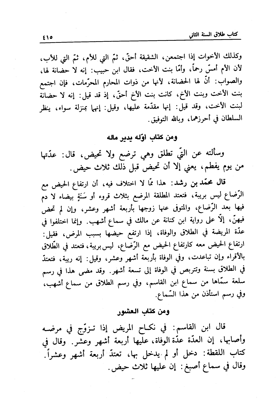 وكذلك الأخوات إذا اجتمعن، الشقيقة أحق، ثم التي للأم، ثم التي للأب؛ لأن الأم أمس رحما، وأما بنت الأخت، فقال ابن حبيب: إنه لا حضانة لها، والصواب: أن لها الحضانة؛ لأنها من ذوات المحارم المحرمات، فإن اجتمع بنت الأخت وبنت الأخ، كانت بنت الأخ أحق؛ إذ قد قيل: إنه لا حضانة لبنت الأخت، وقد قيل: إنها مقدمة عليها، وقيل: إنهما بمنزلة سواء، ينظر السلطان في أحرزهما، وبالله التوفيق.